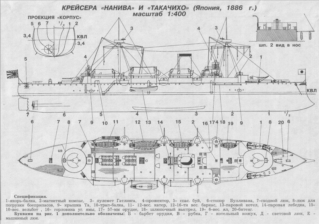Крейсер "Нанива" строился в Англии по заказу японского правительства. Был заложен в Уолкере на верфи Армстронга в марте 1884 г. Ровно через год спущен на воду. В декабре 1885 г вступил в строй.
