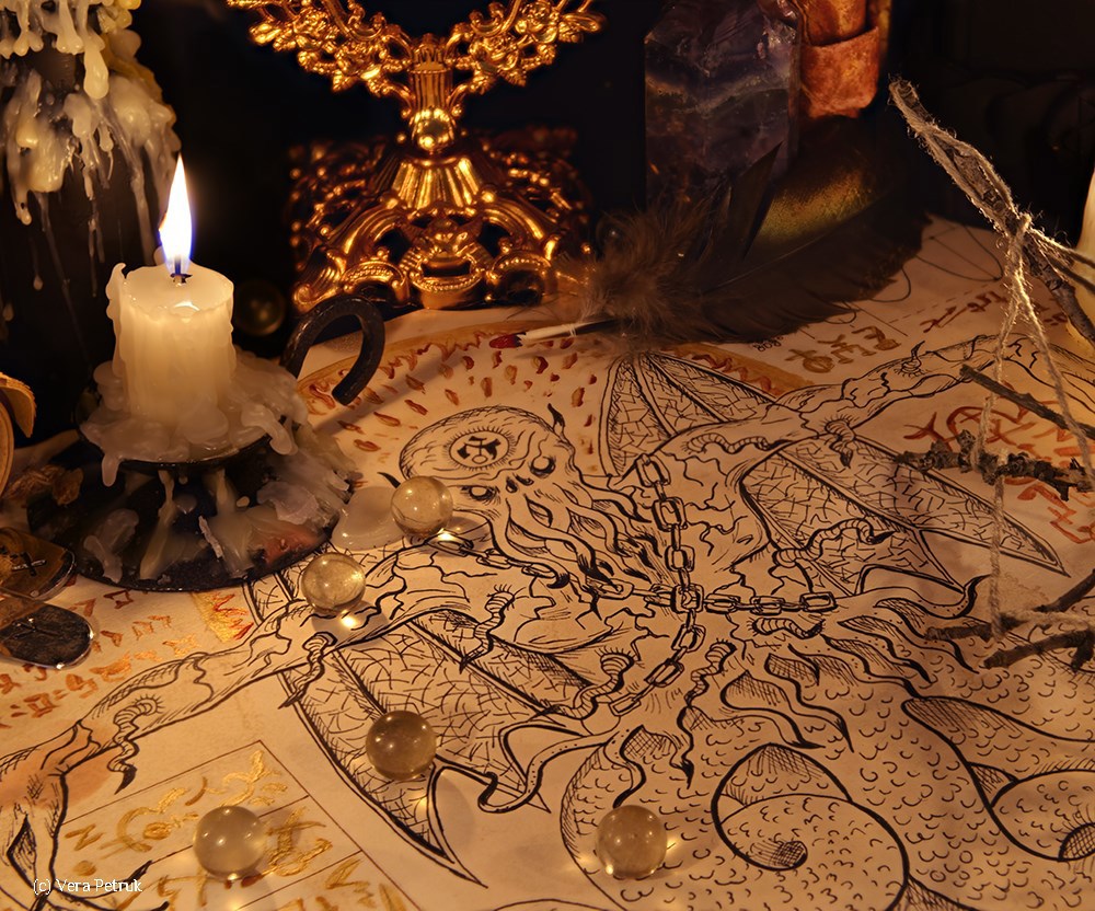 Впечатлившись Лавкрафтом, нарисовала сначала иллюстрацию - Ктулху, вероятно, - потом сфотографировала при свете свечей для атмосферы. Линеры, золотой акрил, бумага, Никон D800.