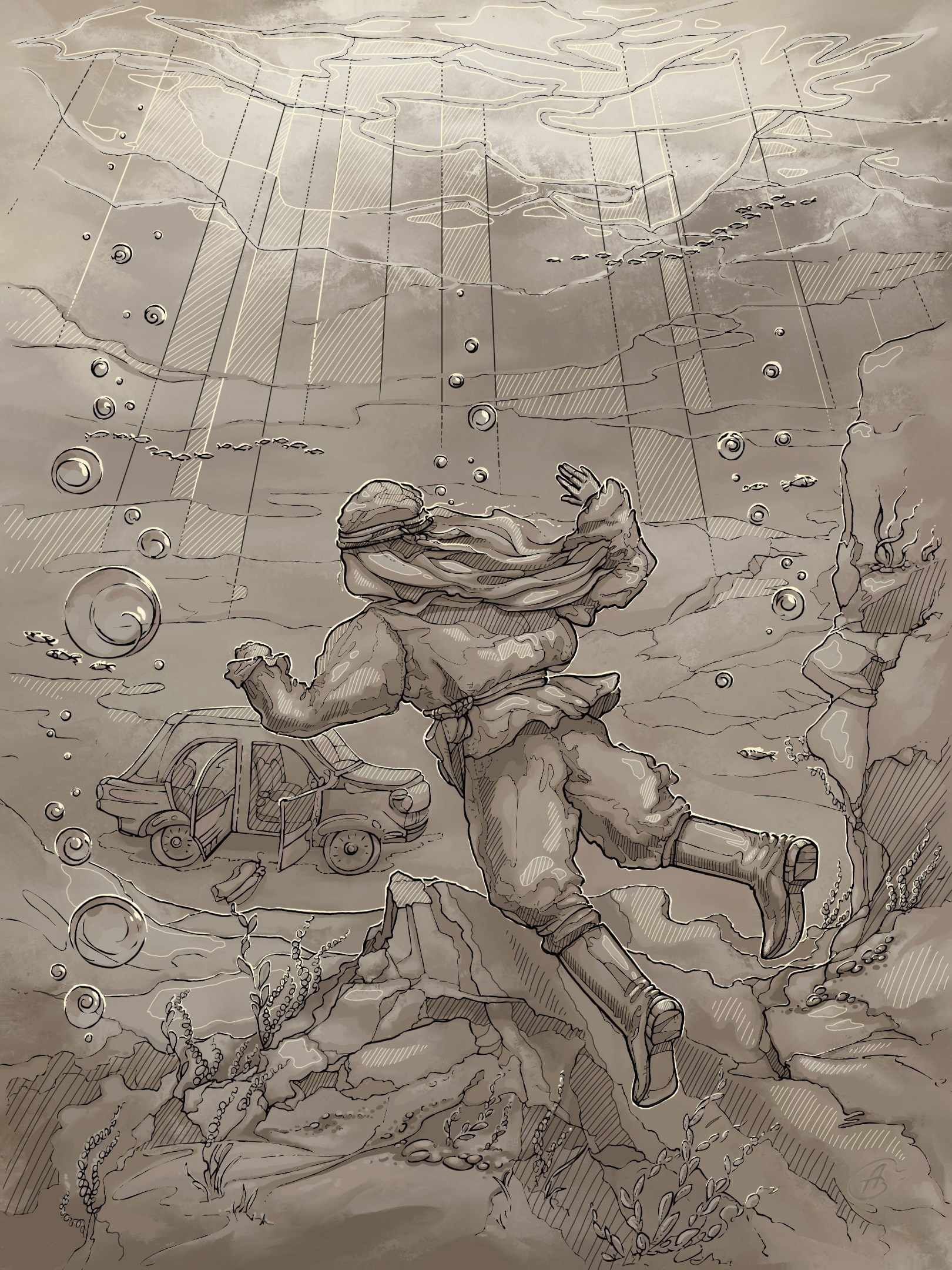 Киваю, сбрасываю пояс с оружием, разворачиваюсь и ныряю обратно. Сейчас мне намного легче, сумка и человек не оттягивают плечи, поэтому довольно быстро достигаю дна. Машину удалось найти не сразу, так как оказалось, что она погрузилась чуть дальше, в небольшую впадину. Со стороны утонувший транспорт выглядел очень печально, словно брошенный щенок с приветливо распахнутыми дверьми.