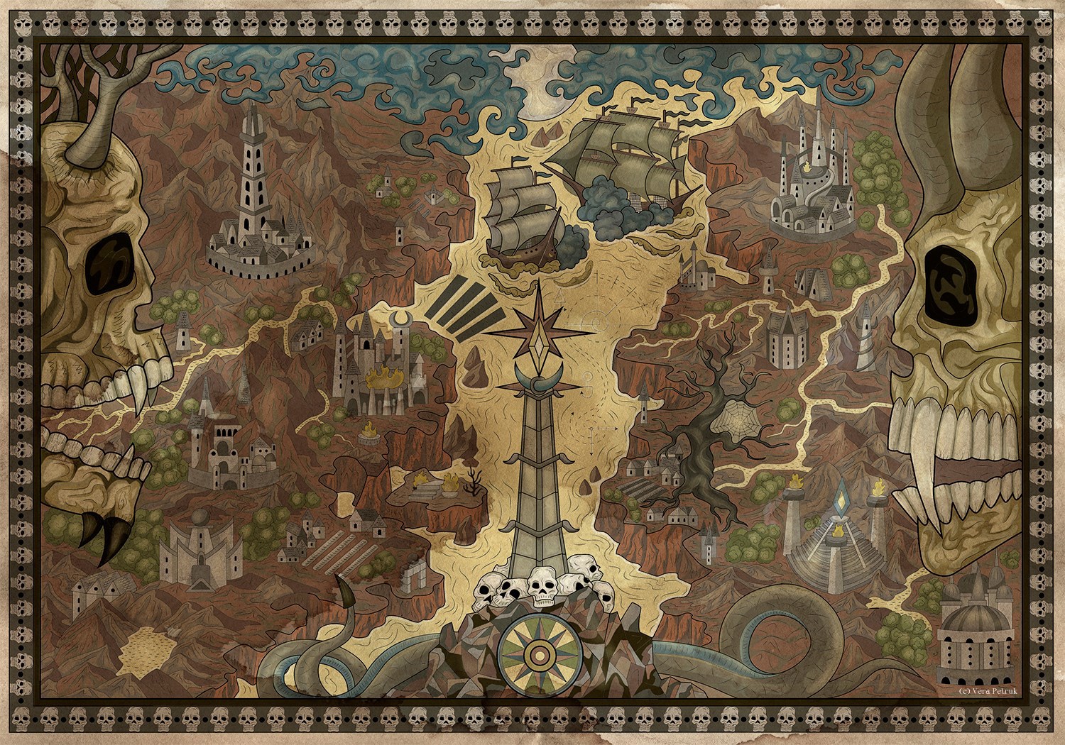 Закончила готично-фэнтезийную карту. Так как работала с перерывом на другие проекты, то почти месяц вышел. Сначала думала нарисовать ее в Иллюстраторе, но все-таки вычерчивание - не мое, и перешла в Infinite Painter, где свободнее мажется кистью). Сложнее всего дается архитектура, планирую домишки и замки еще разнообразнее в следующих картах.