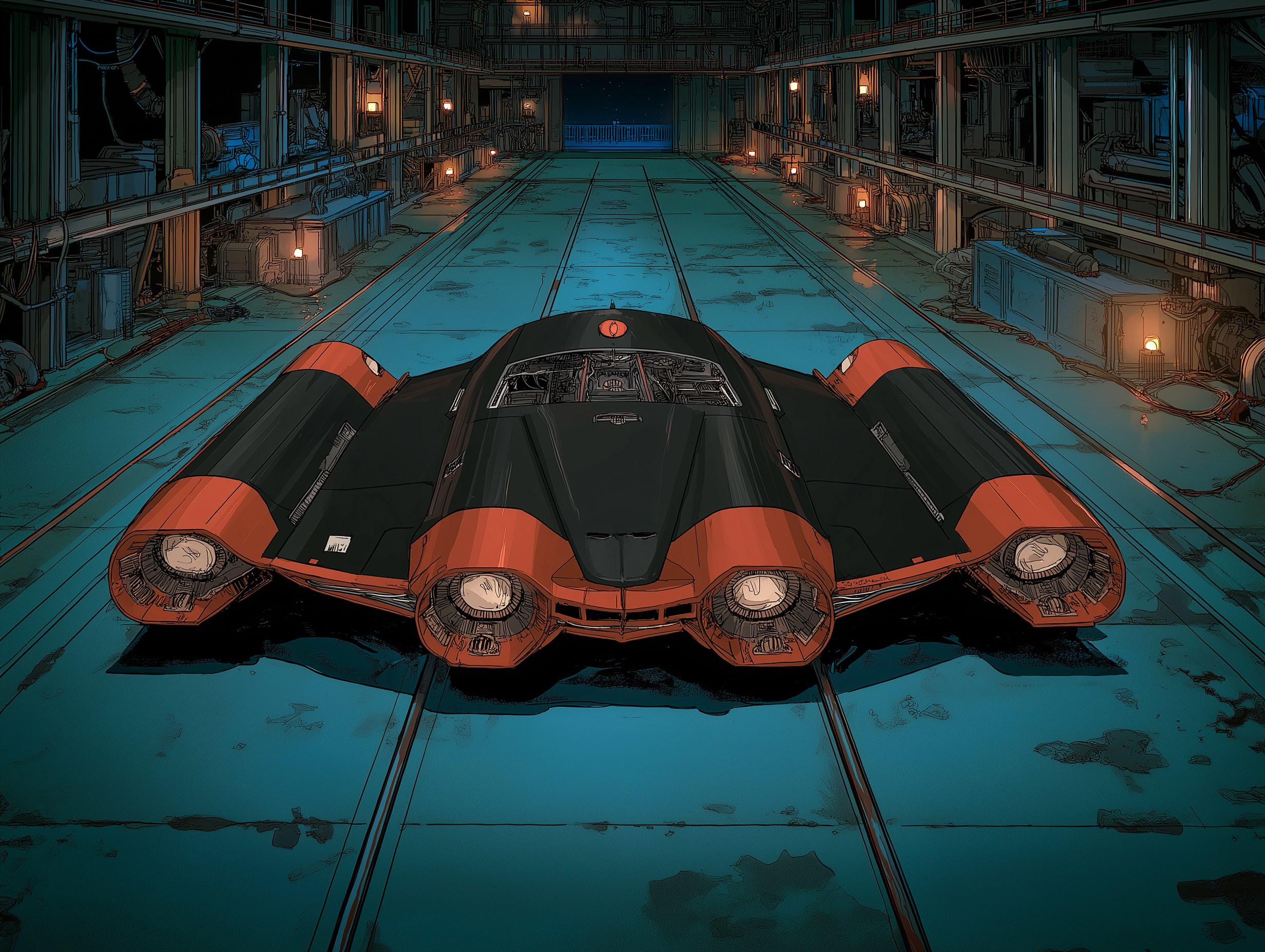 https://s.mj.run/EplIHqJ1mzw A black, teardrop-shaped space fighter with four engines at the rear. Pylons with black cylinders on the sides. It sits on the metal floor of a space cruiser's hangar. --ar 4:3 --sref 68072783 --profile ajdobjp --stylize 650 --weird 400