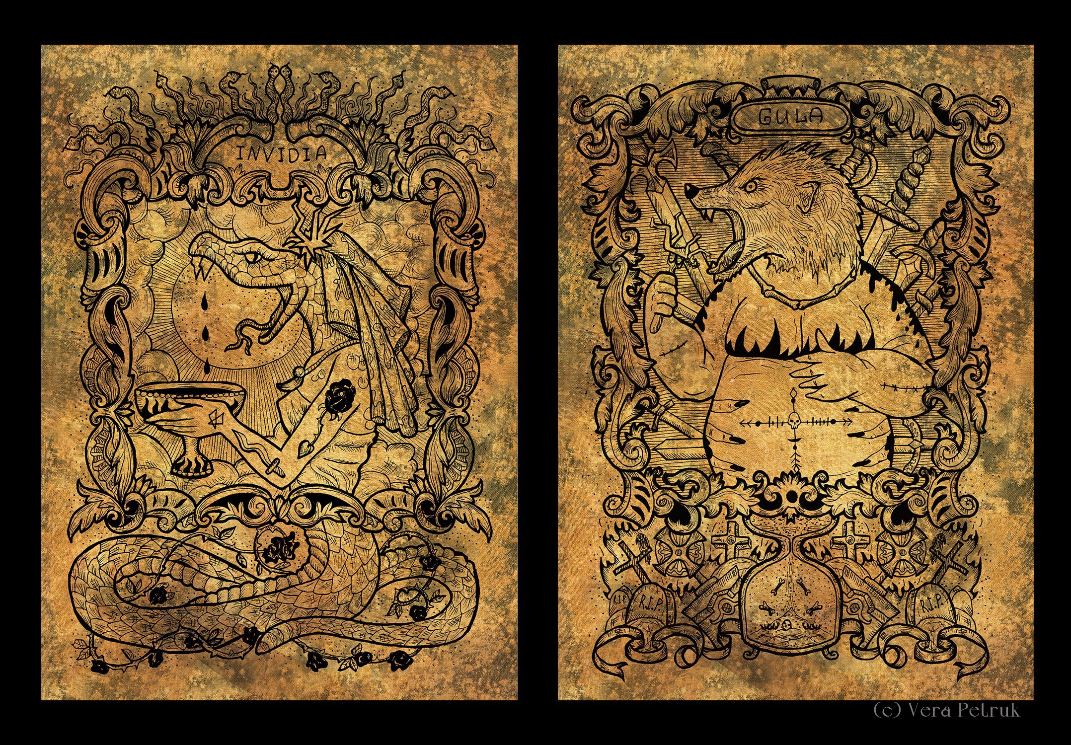 Две карты из проекта "Семь смертных грехов": зависть - змеюка такая истекающая ядом, и обжорство - тут сильно авторская интерпретация на тему) Invidia и Gula - названия грехов на латыни.