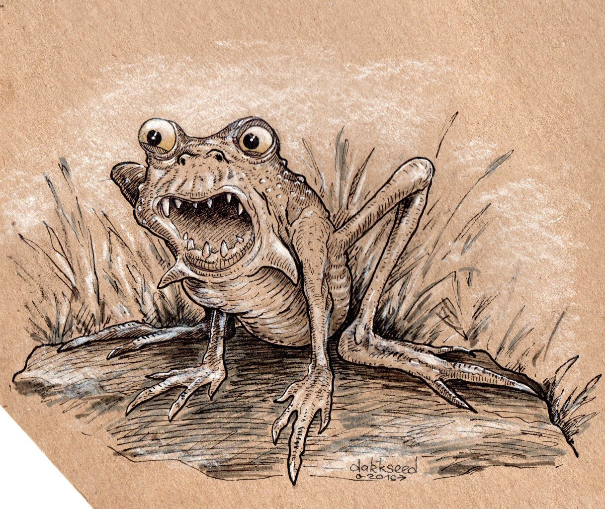 Лягух Автор: Игорь Авильченко Как всегда картонка, ручка. Потом решил обвести маркерами и добавить белого карандаша. лягушка, монстр, скетч, авторский арт, графика, юмор, рисунок, фэнтези 37 Пожаловаться