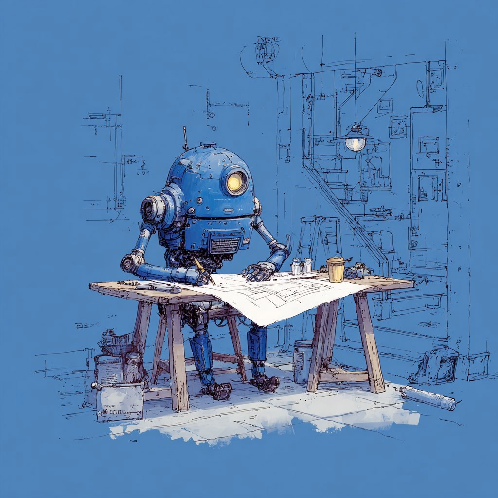 Иллюстрация #421 Автор: Ярослав An android robot sits at a table and draws a blueprint. Atomic Punk --chaos 5 --stylize 150 retrofuturism, midjourney, atomicpunk 23 Пожаловаться