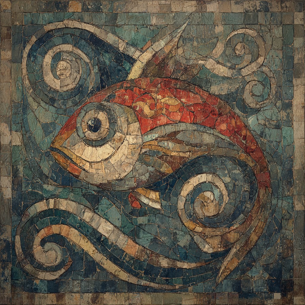 рыбный день Автор: Ярослав A symbolic image of a fish in water. A mosaic of large elements. --chaos 15 --profile ajdobjp --stylize 150 мозаика, рыба, midjourney 36 Пожаловаться