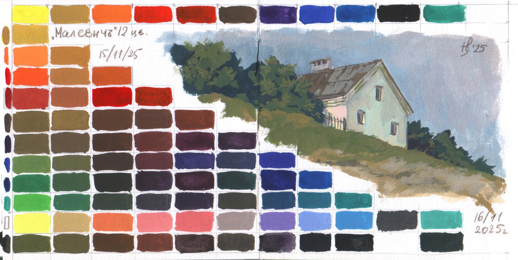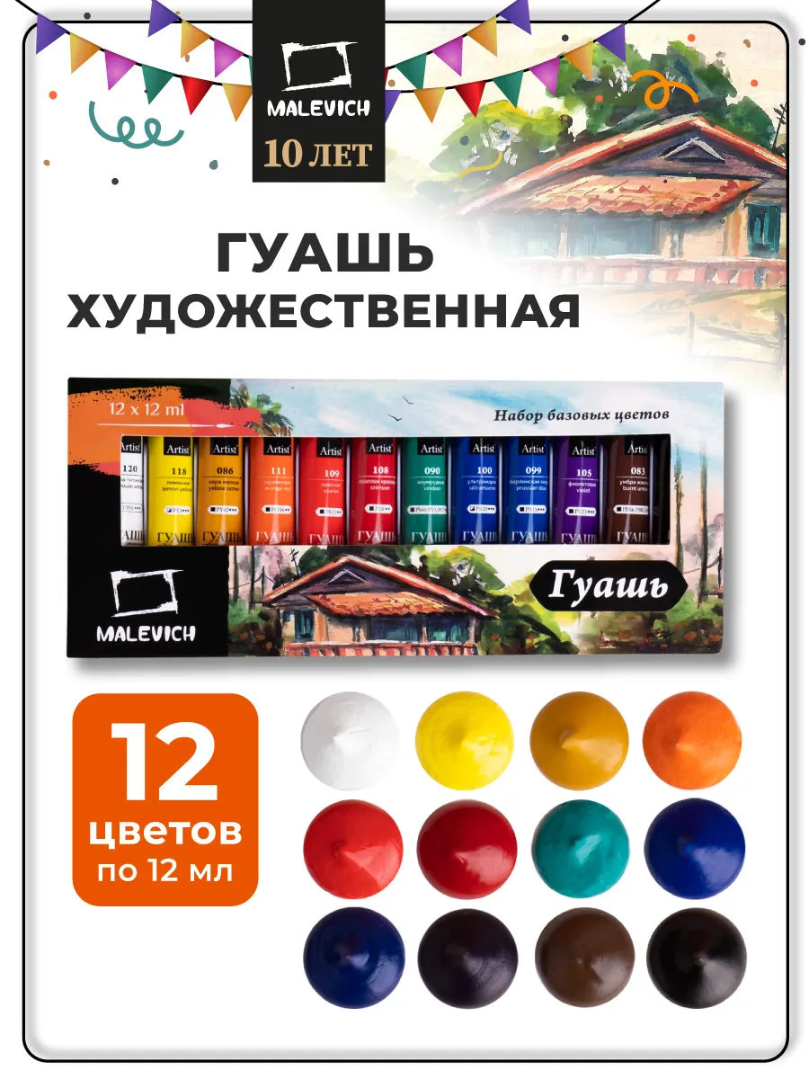 А тут как раз "черная пятница" на ВБ-хе, ну я и прикупила за неполные 300 рублей устаревший набор гуаши в тюбиках "Малевичъ" 12 цветов. Еще первой итерации. Помню, что, в принципе, она достаточно яркая и не белеет при высыхании, хвалили ее, когда она только появилась. А мне многого и не надо.
