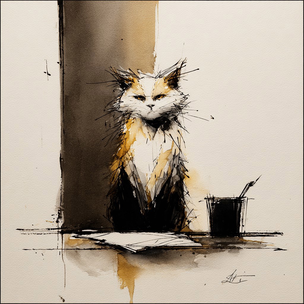 A writer cat stands at a desk and looks at the camera questioningly and expectantly. --chaos 30 --sref 2824101016 --profile ajdobjp --stylize 200