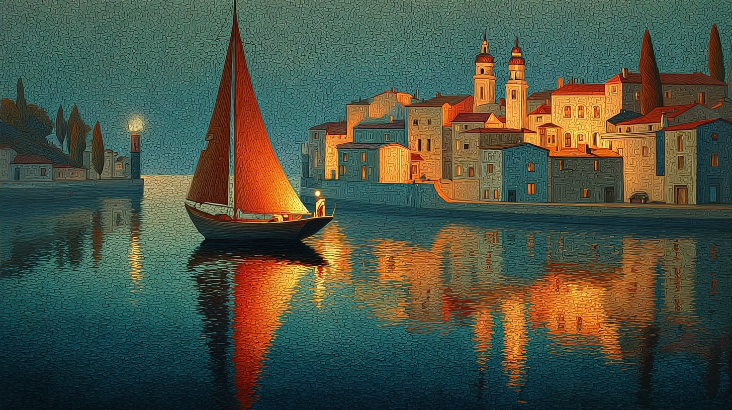A light small yacht with sails raised in the harbor. Summer calm at sunset. Art by Vladyslav Yerko --chaos 5 --ar 16:9 --stylize 150