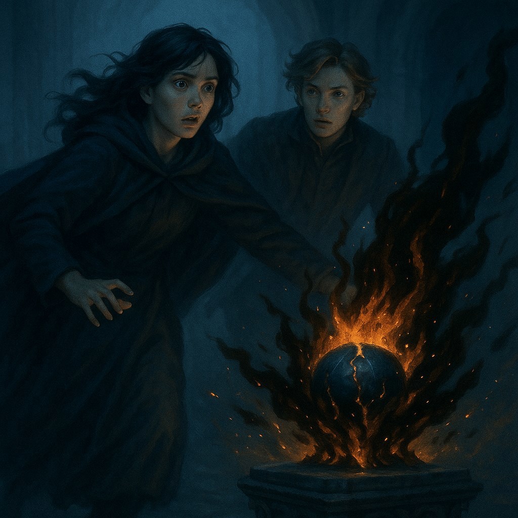 Здесь Лиора и Кассель наблюдают, как артефакт начинает нестабильно пульсировать. Это та самая сцена, где сфера мгновение спустя взорвётся тёмным огнём. Лица героев - испуг, недоверие, попытка понять, что пошло не так. Иллюстрация подчёркивает важную деталь из текста: магия реагирует именно на Лиору, несмотря на её «пустоту». Это момент первого большого сбоя, предвестие будущих событий.