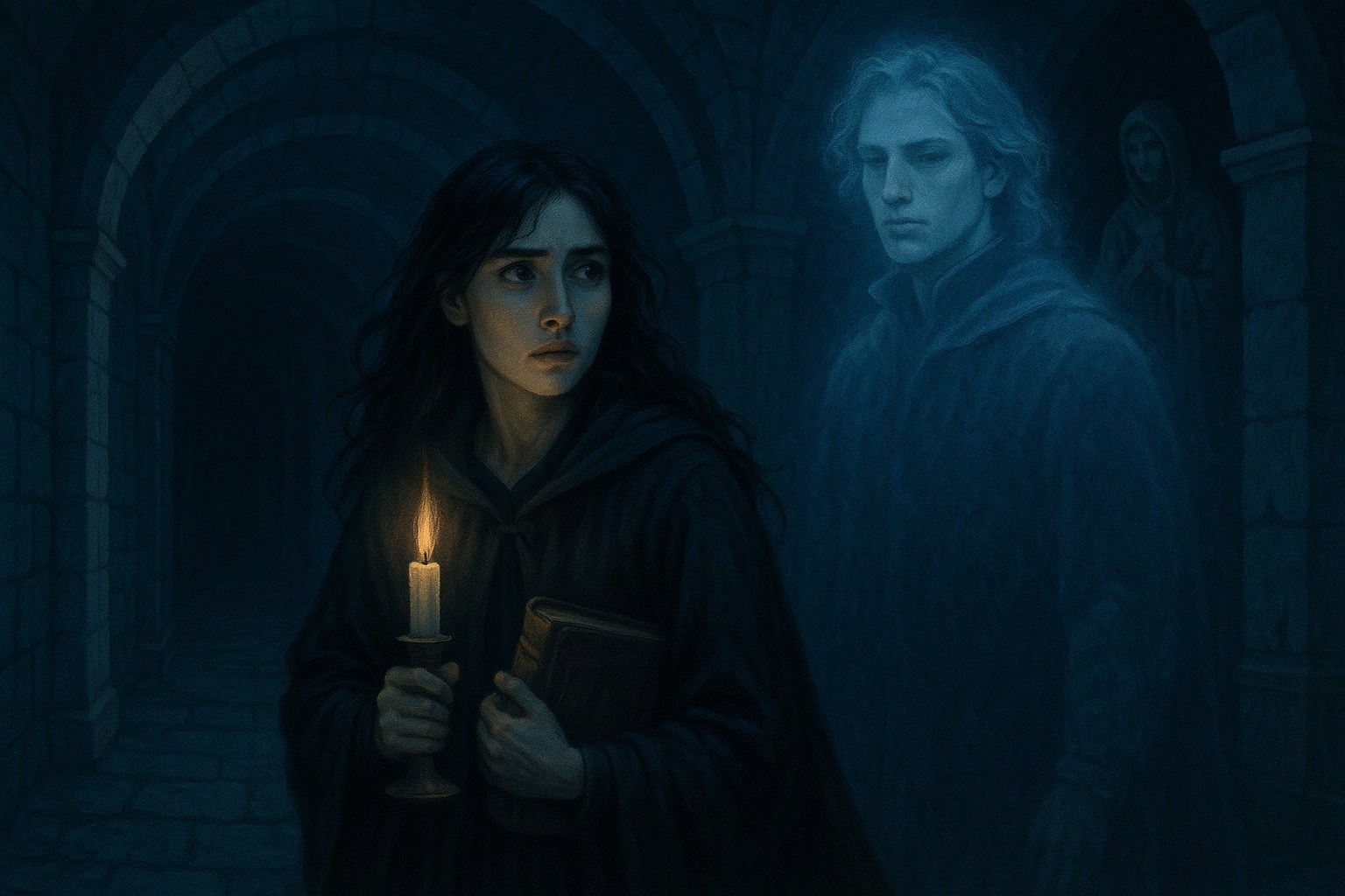 Одна из ключевых сцен книги. Лиора спускается в третий подвал Академии, и там впервые сталкивается с призраком Риннара. В тексте она не понимает, дух это, отголосок магии или что-то другое. Свет её свечи почти гаснет рядом с холодным свечением фигуры, а за спиной духа угадывается старая статуя - символ памяти Академии. Иллюстрация передает ощущение истины, которая приходит через страх и одиночество.