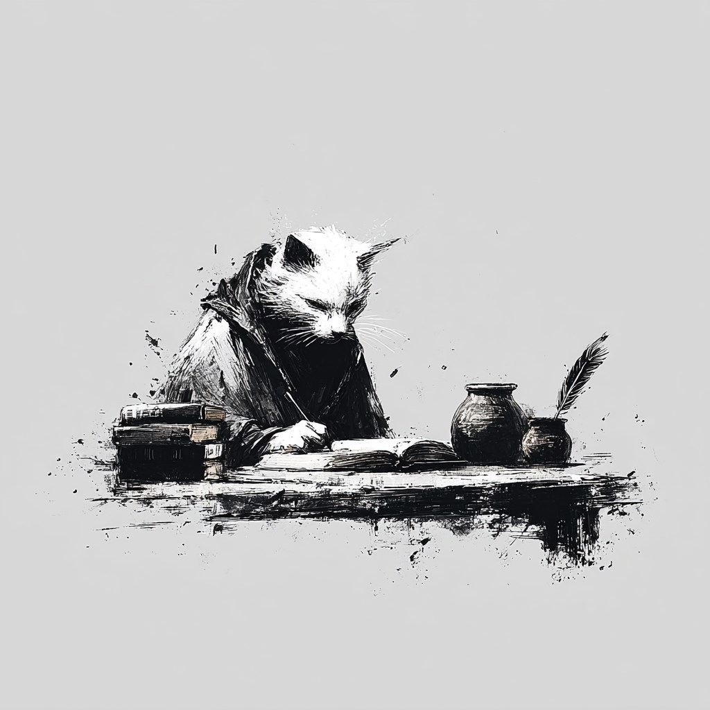 The cat is writing a fantasy book --chaos 15 --sref 3263996448 --profile ajdobjp --stylize 150