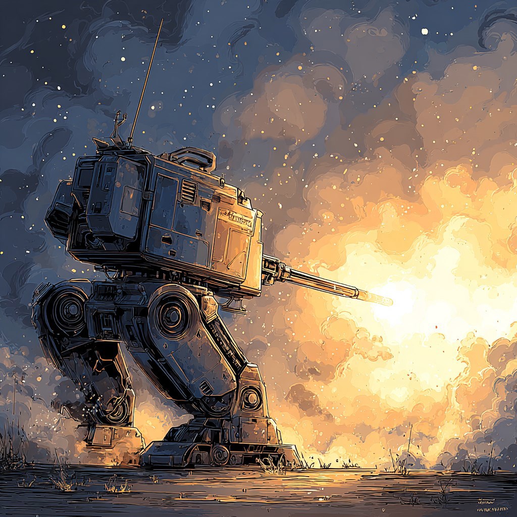 A mechanoid firing a turret-mounted automatic cannon. MechWarrior style