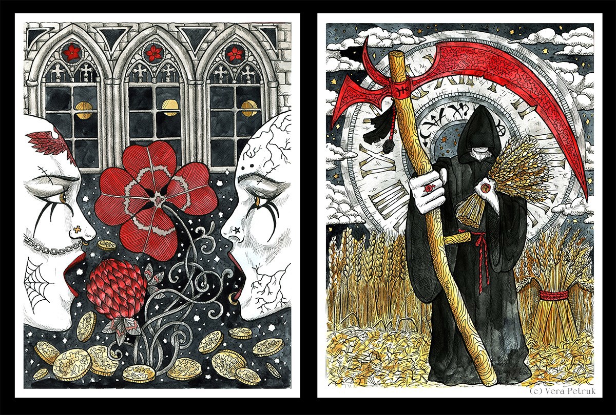Иллюстрации для карт "Клевер" и "Коса" оракула Ленорман. Рисовала эту колоду года четыре назад, называется "Готические мистерии Ленорман", тираж выпускало издательство Magic-Kniga.