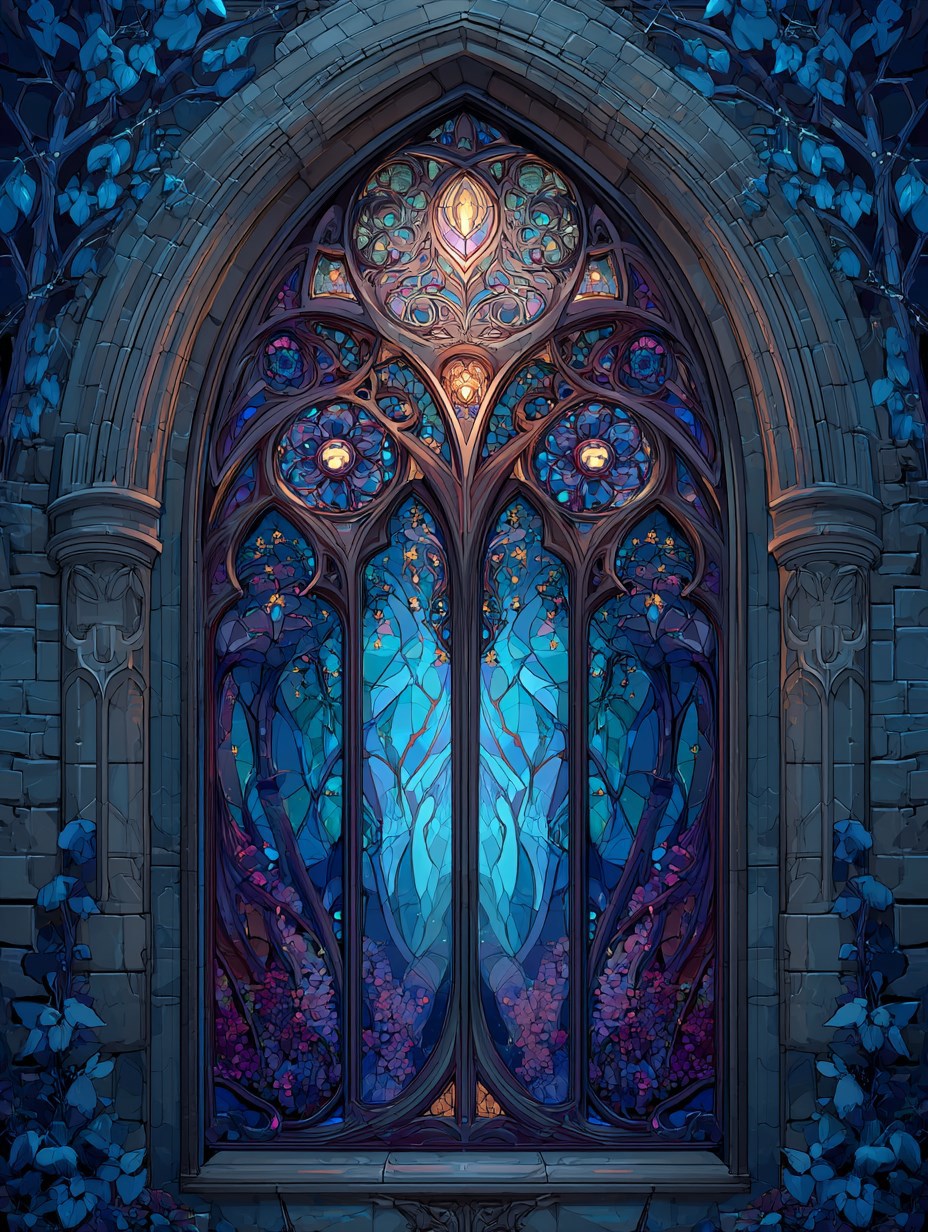 A tall Gothic lancet window. Emphasized elements of magic and enchantment. Rich color palette with very tender mystical shades (purple, blue, emerald) , fantasy art style --chaos 5 --ar 3:4 --stylize 150