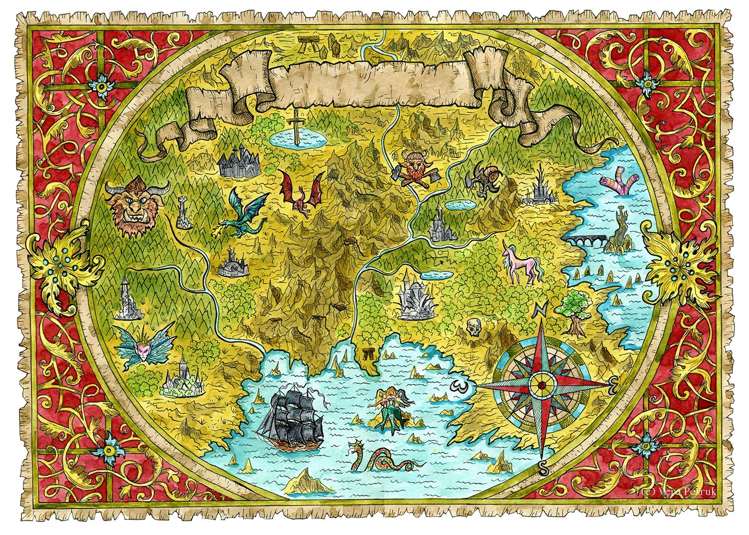 Одна из моих самых первых фэнтези-карт. Здесь все немного корявенько, зато с любовью к жанру) Акварель, линеры, бумага.