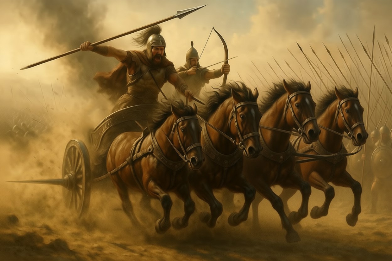 Длинные, в локоть, изогнутые, как ятаганы, стальные серпы, намертво прикрепленные к осям колес. Они блестели под утренним солнцем не тусклым блеском железа, а холодным, «мокрым» блеском тщательно заточенной, смертоносной стали. Они вращались вместе с колесами, и этот мерцающий ореол вокруг каждой колесницы был зрелищем, парализующим волю. Это было оружие не для дуэли, не для боя. Это было оружие для косьбы. Для конвейерного уничтожения живой плоти, превращения строя в кровавое месиво за считанные секунды...
