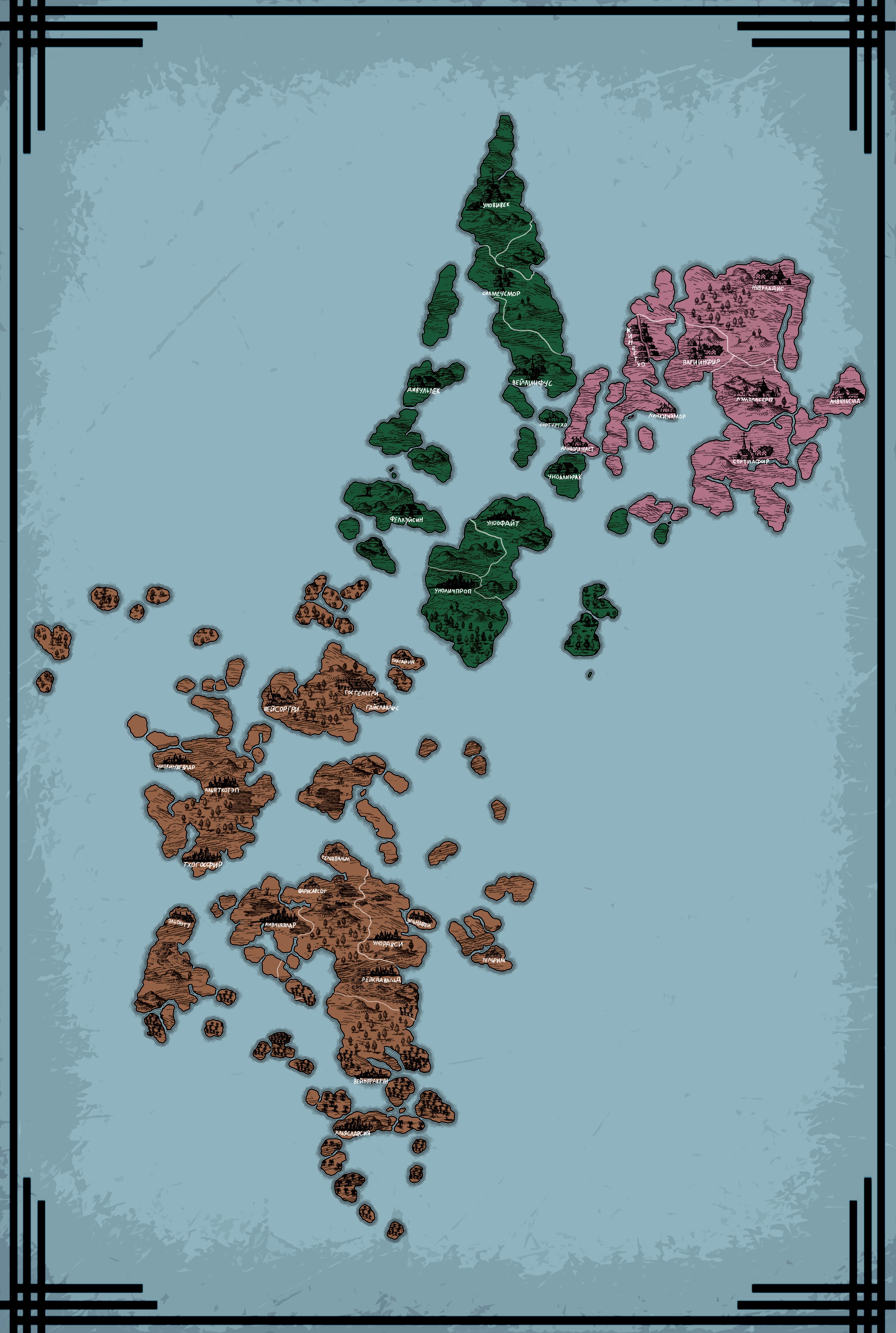 Эти земли столь же суровы и опасны, как и здешние обитатели. Сами острова отражают их проклятие, разделяясь на три ужасающих зоны: густые и душные заросли Вларпенрала, где каждый шепот листьев таит угрозу; паучье логово Пропенрала, опутанное клейкой паутиной; и ядовитые болота Серпенрала, где сама почва источает смертельный яд.