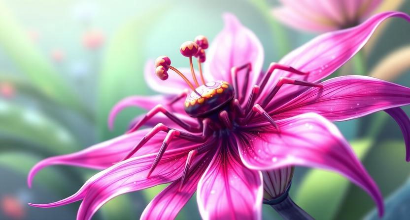 Эдвард сидел на скамейке, окружённой шорохом ветра, и любовался цветами паучьей лилии — их изящными лепестками в оттенках розового и пурпурного, словно тонкая паутина, распускающимися под мягким солнцем. Он погрузился в мысли, наслаждаясь этим спокойным и загадочным природным зрелищем.