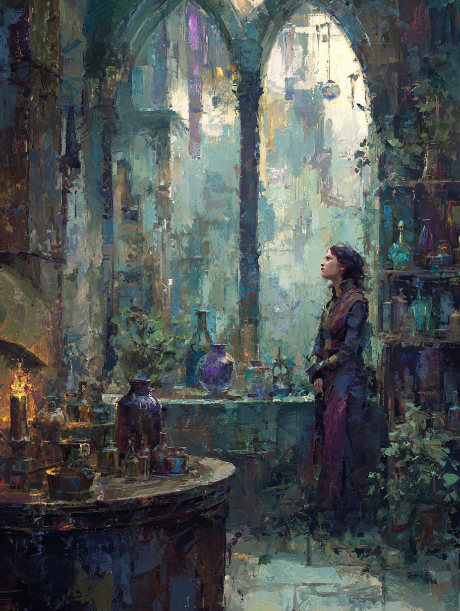 Waiting for Goddot. Emphasized elements of magic and enchantment. Rich color palette with very tender mystical shades (purple, blue, emerald), fantasy art style --chaos 5 --ar 3:4 --profile ajdobjp --stylize 150