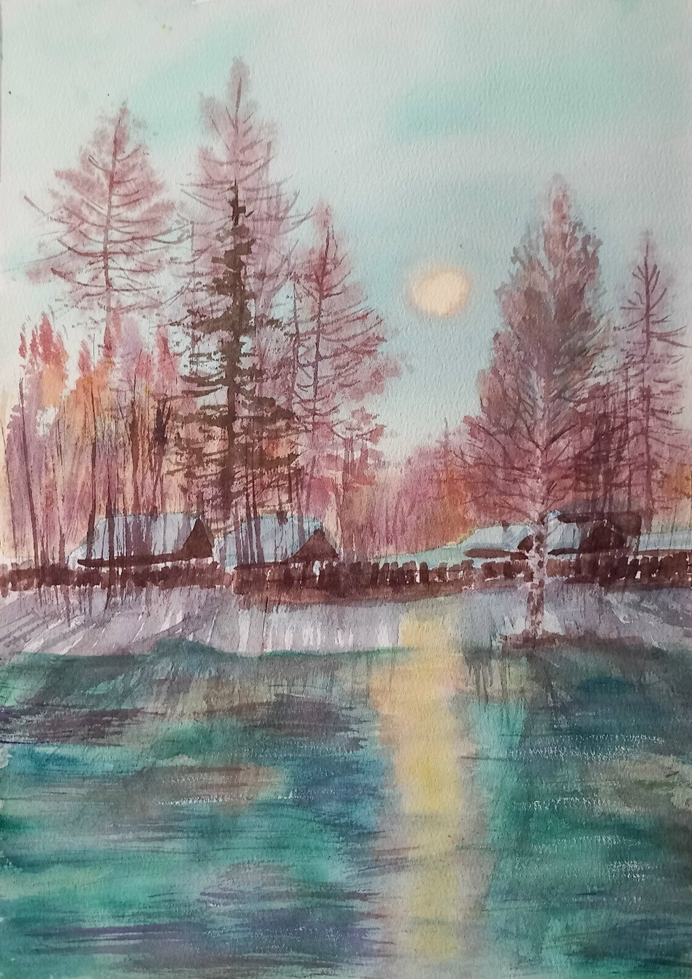 Зимняя лунная ночь Автор: Ольга Левонович Акварель, хлопок, 380х260 см. северный пейзаж, акварель 43 Пожаловаться