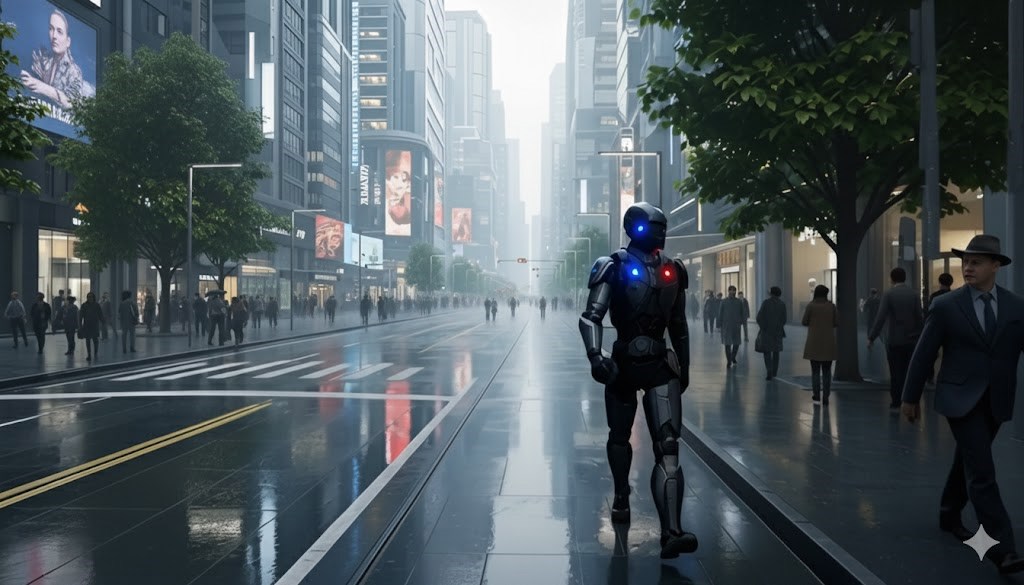 На этом арте — именно то настроение, которое я вкладывал в персонажа. Дождь, равнодушный город и одинокая фигура, которая продолжает идти вперед, потому что таков его выбор, а не программа.