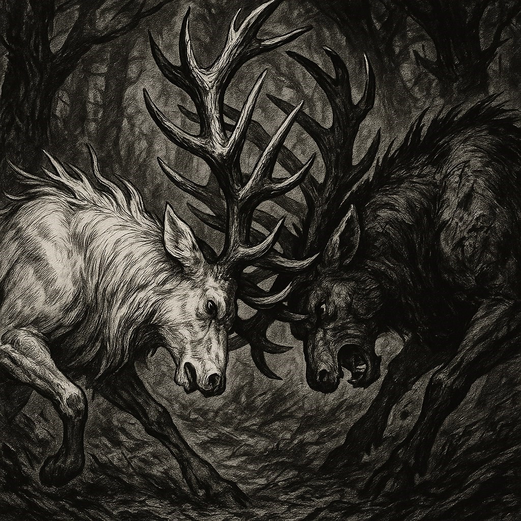 Иллюстрация к Главе 11 книги "Рог. Наследник Леса". Смертельная схватка Короля Мощи и жестокого Утёса. Черно-белая гравюра. Сгенерировано нейросетью.