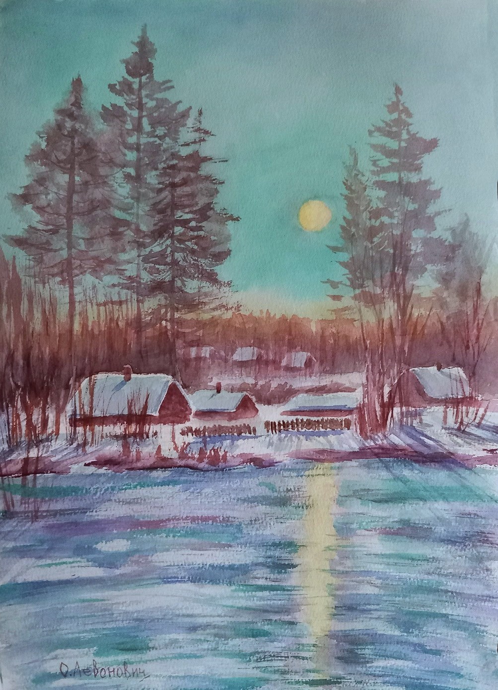 Зимняя лунная ночь - 2 Автор: Ольга Левонович Ещё один вариант картины про северную лунную ночь.Акварель, хлопок, 380х260 см. зимний пейзаж, акварель 21 Пожаловаться