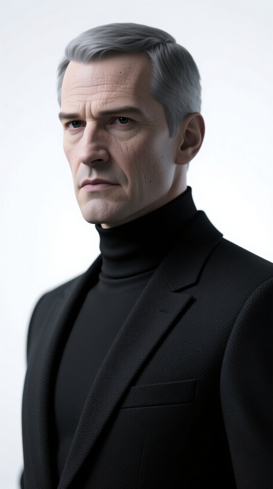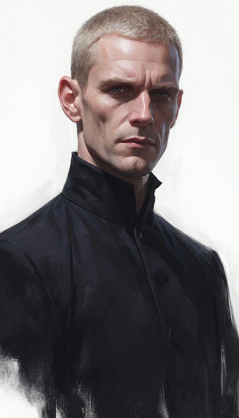 Он был одет во всё чёрное: чёрный, облегающий, лишённый каких-либо складок или молний высокий воротник, чёрные перчатки, чёрные брюки, чёрные туфли с глухими подошвами. Его поза была неестественно прямой, но не напряжённой — скорее, это была абсолютная экономия движения, будто каждое микросокращение мышц было просчитано и оправдано. Лицо — бледное, скуластое, с коротко стриженными пепельными волосами и глазами угольно-чёрными, бездонными, как провал в ночном небе. В них не читалось ни любопытства, ни раздражения, ни усталости. Только фокусировка. Как у хирурга или снайпера. Он напоминал клинок, застывший в ножнах, — изящный, холодный и создающий вокруг себя поле тихой, безэмоциональной опасности.