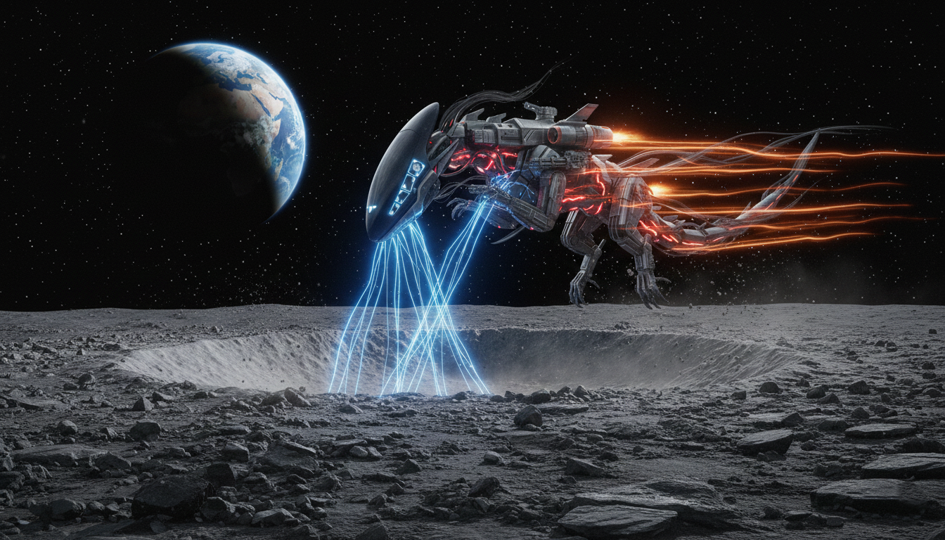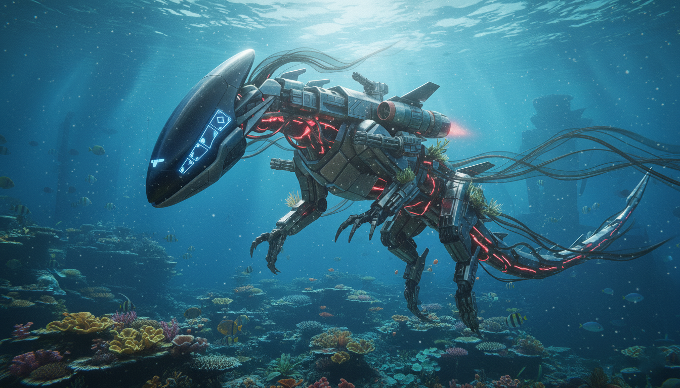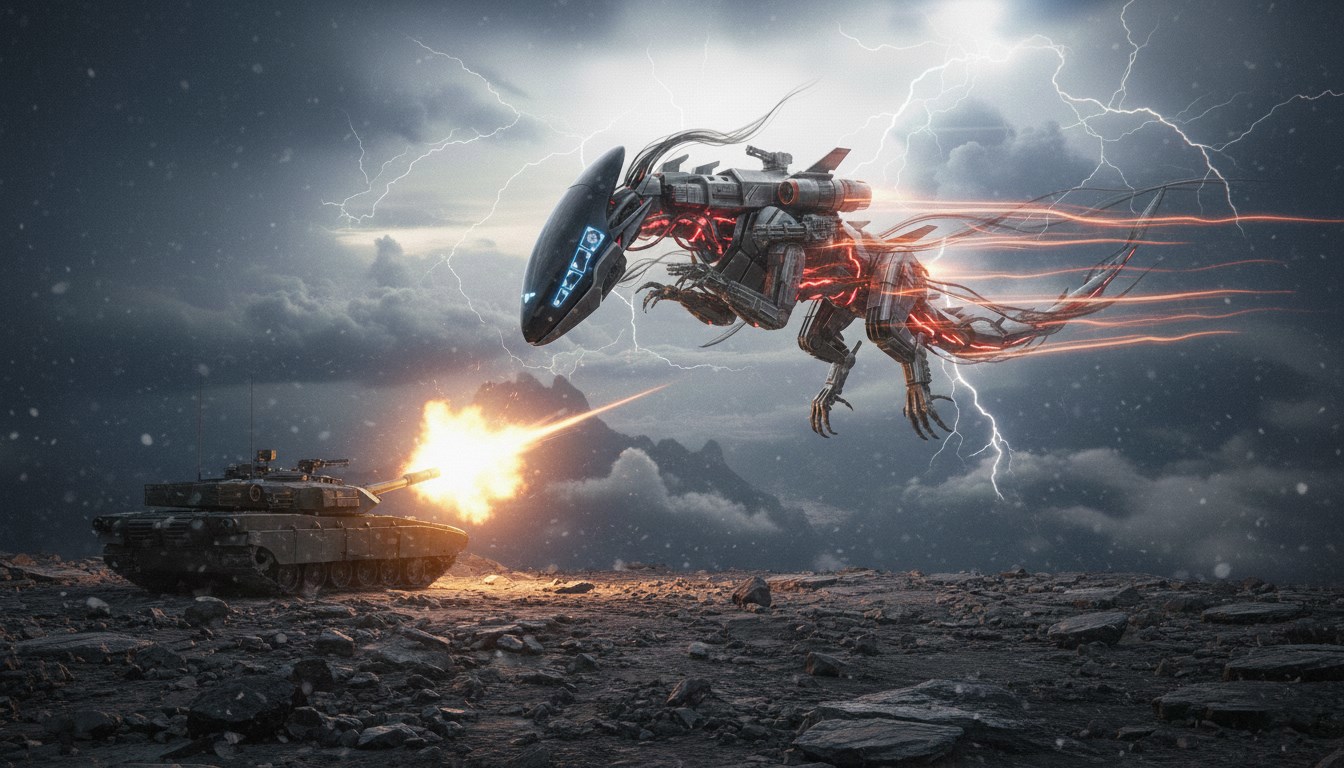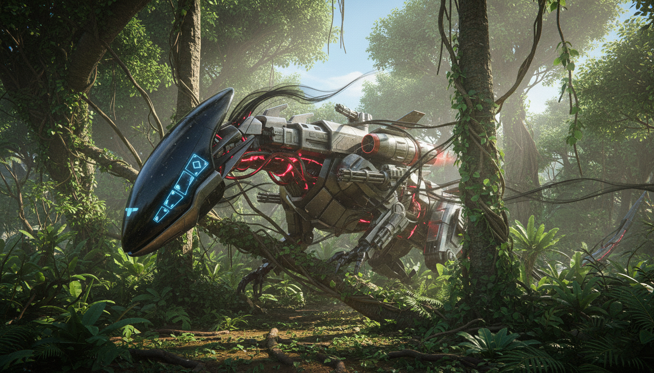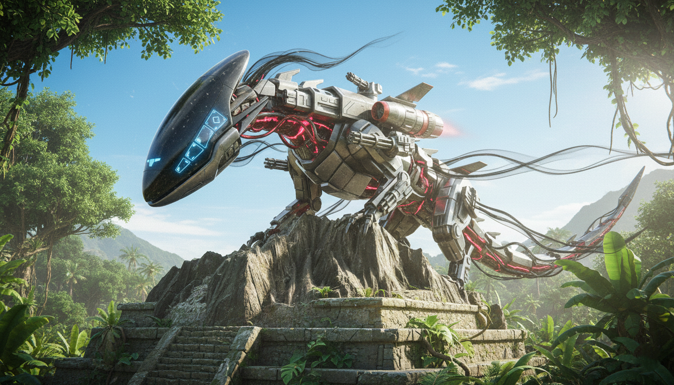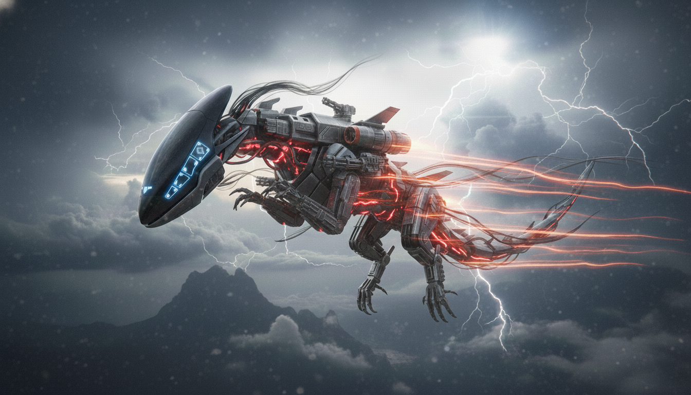 Из тумана, тихо шипя, выползли и зависли в воздухе несколько модулей. Гладкие, обтекаемые, лишённые люков, заклёпок или каких-либо надписей. Один напоминал голову дракона, если бы дракона проектировала не природа, а искусственный интеллект, стремящийся к минимализму и аэродинамическому совершенству: каплевидный, чёрный, с геометрическими панелями сенсоров, светящимися холодным синим светом. Другие — сегменты мощных конечностей, чьи окончания напоминали не когти, а скорее гладкие, отполированные до чёрного зеркального блеска копья-долота, готовые крошить скальную породу. А рядом покоился блок, который можно было принять за крыло из обсидиана: сотни тонких, идеально подогнанных друг к другу пластин из чёрного композита, застывших в ожидании команды расправиться и рассечь воздух.