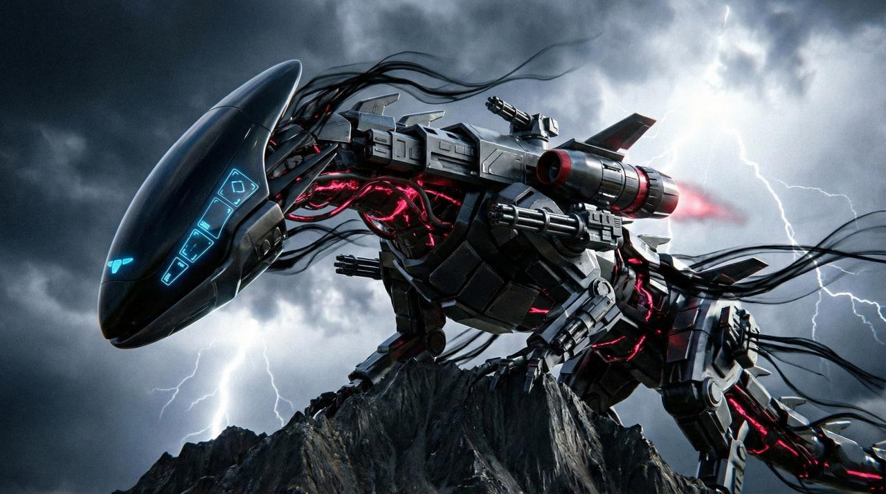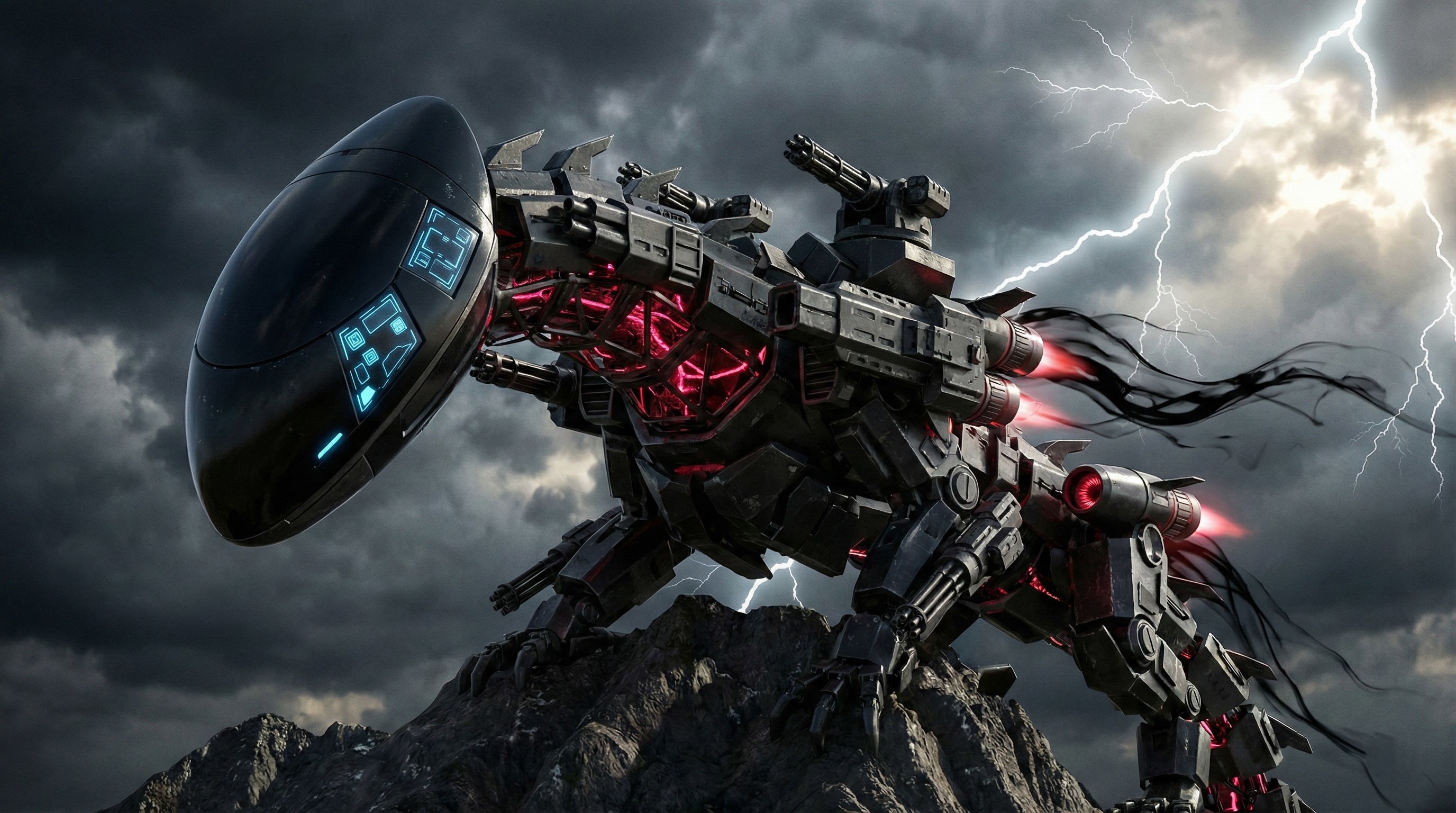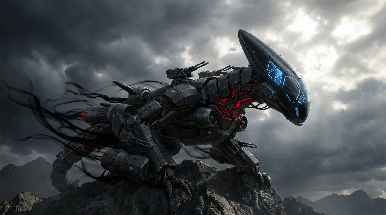 Из тумана, тихо шипя, выползли и зависли в воздухе несколько модулей. Гладкие, обтекаемые, лишённые люков, заклёпок или каких-либо надписей. Один напоминал голову дракона, если бы дракона проектировала не природа, а искусственный интеллект, стремящийся к минимализму и аэродинамическому совершенству: каплевидный, чёрный, с геометрическими панелями сенсоров, светящимися холодным синим светом. Другие — сегменты мощных конечностей, чьи окончания напоминали не когти, а скорее гладкие, отполированные до чёрного зеркального блеска копья-долота, готовые крошить скальную породу. А рядом покоился блок, который можно было принять за крыло из обсидиана: сотни тонких, идеально подогнанных друг к другу пластин из чёрного композита, застывших в ожидании команды расправиться и рассечь воздух.
