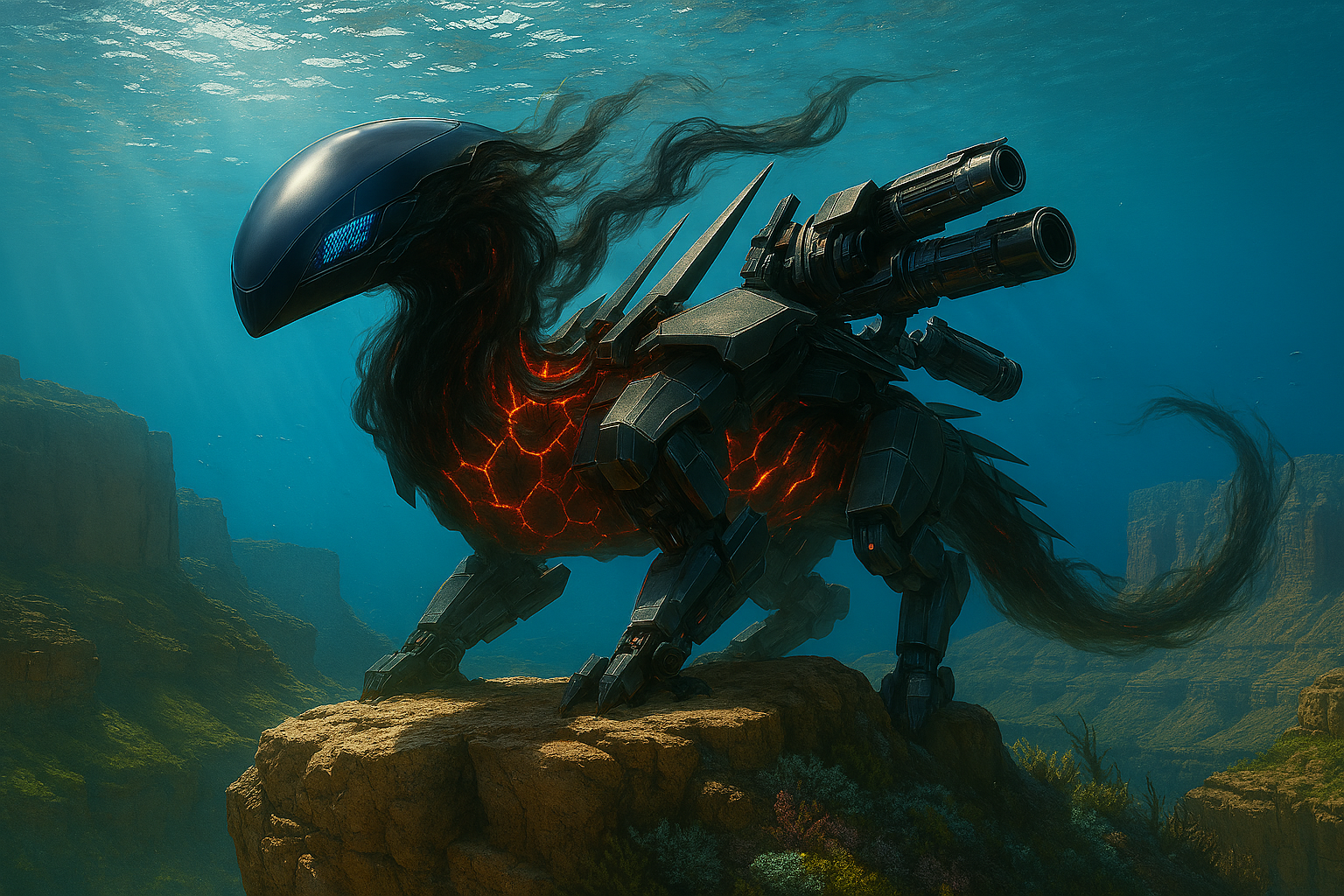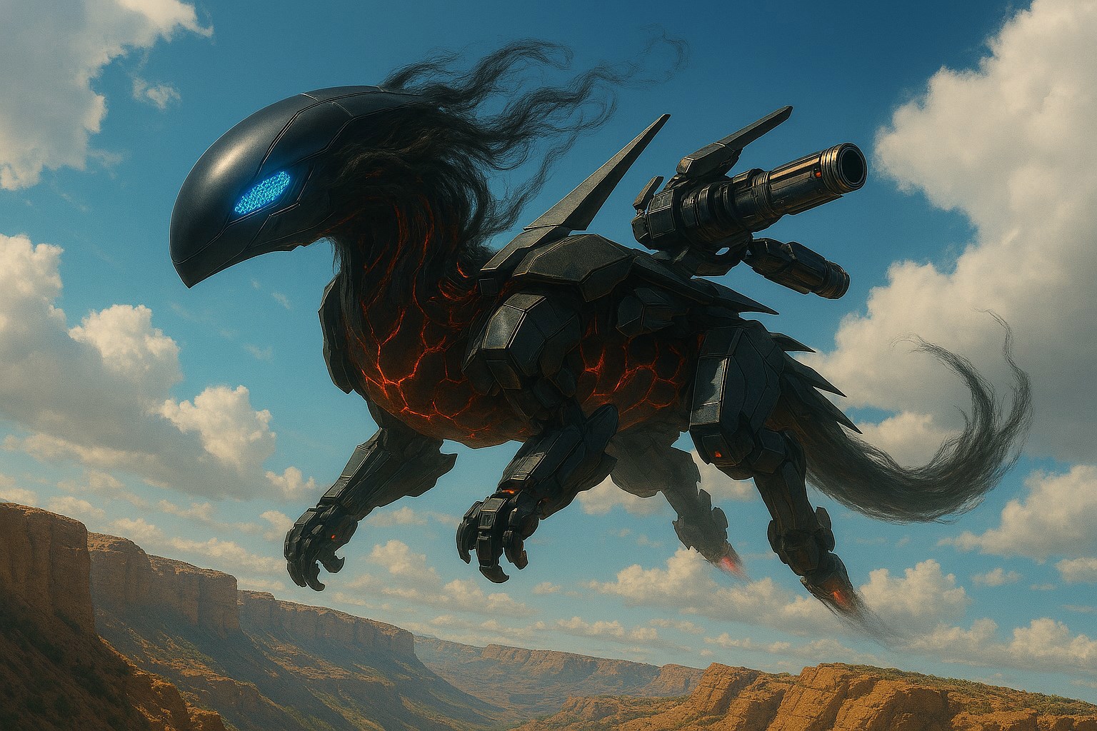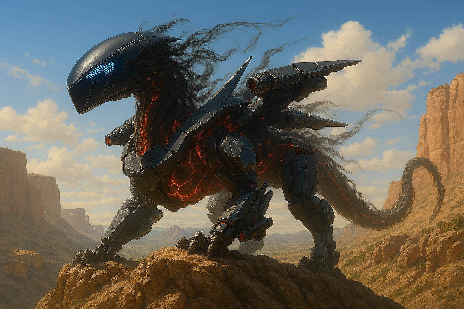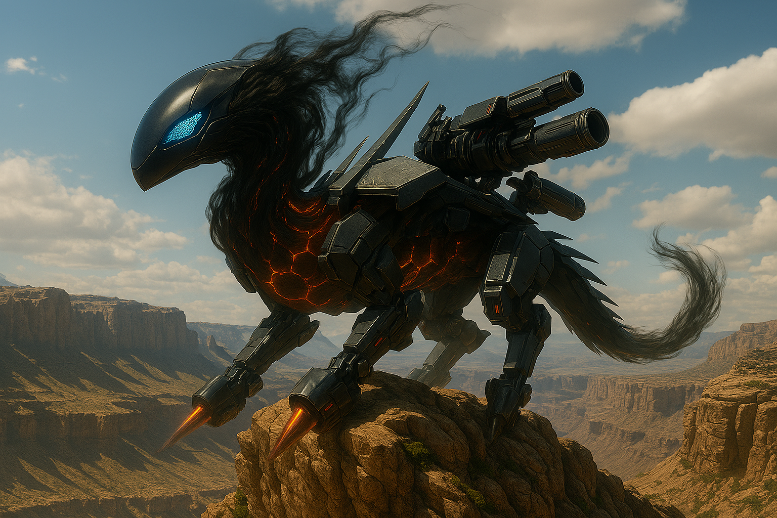 Из тумана, тихо шипя, выползли и зависли в воздухе несколько модулей. Гладкие, обтекаемые, лишённые люков, заклёпок или каких-либо надписей. Один напоминал голову дракона, если бы дракона проектировала не природа, а искусственный интеллект, стремящийся к минимализму и аэродинамическому совершенству: каплевидный, чёрный, с геометрическими панелями сенсоров, светящимися холодным синим светом. Другие — сегменты мощных конечностей, чьи окончания напоминали не когти, а скорее гладкие, отполированные до чёрного зеркального блеска копья-долота, готовые крошить скальную породу. А рядом покоился блок, который можно было принять за крыло из обсидиана: сотни тонких, идеально подогнанных друг к другу пластин из чёрного композита, застывших в ожидании команды расправиться и рассечь воздух.