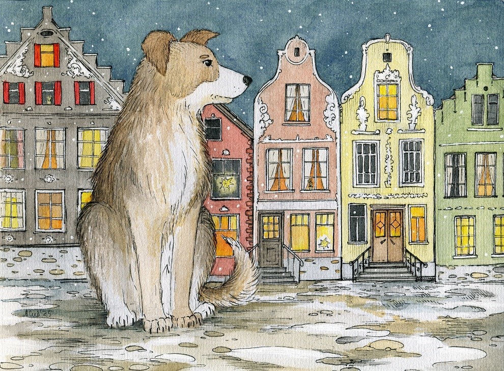 Тоже долго дожидавшийся своего полноценного воплощения эскиз. Хотелось найти (сохранить?) приемлемый баланс между условностью, стилизацией и все-таки реализмом. Из минусов – непонятная перспектива, слишком условная и не очень-то видная. Из плюсов – собачка славная и в целом настроение как из сказок Андерсена, но пободрее) Словом, небольшая история про едва начинающуюся зиму (а у нас никак не начнется)))