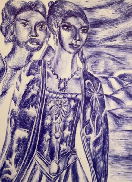 Мне хотелось передать контраст между тяжестью королевского наряда и бдительной, сдержанной фигурой Клаори. Ручка идеально подчеркивает текстуры: от бархата и украшений до грубой одежды телохранителя и порывов ветра.