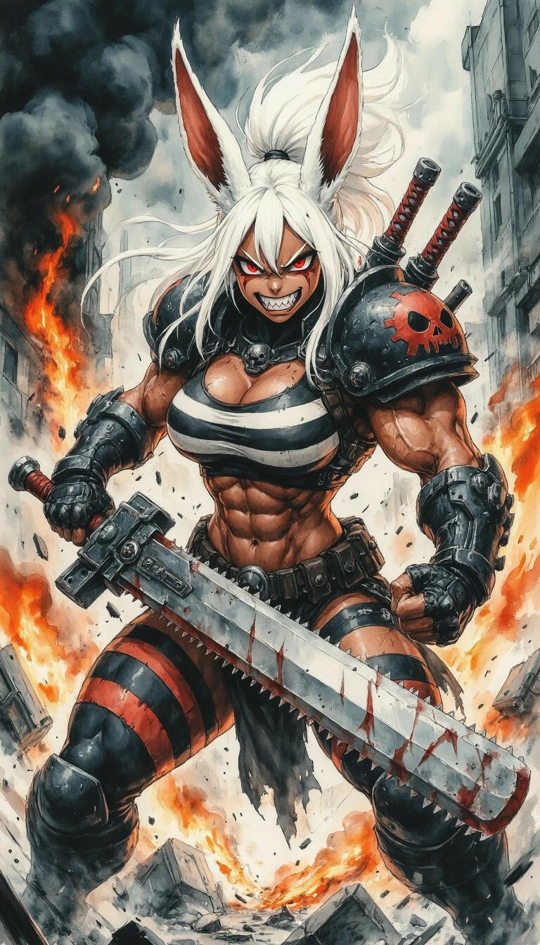 Вольная иллюстрация кроссовер МГА и вархаммер 40к . Rumi Usagiyama (Miruko) /Руми Усагияма (Мируко). Пи.Си Утро понедельника,Руми дома - что пила и с кем,не помнит.  Где была - не знает. Похмелье,всё болит и ноет во всех местах. На полу у кровати валяется непонятная железная оглобля ,отдаленно похожая на здоровенную бензопилу. На столе фото ,а на его реверсе сердечко и подписи каких-то: Дзинча,Кхорна и Его Императорского Величества.