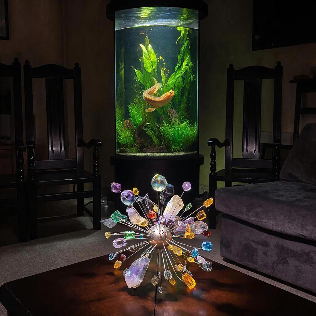 На низком столике в центре комнаты стояла странная конструкция, похожая на сферический кристаллический сад. Из металлического ядра торчали десятки тонких штырьков, на которые были нанизаны кристаллы всевозможных форм и цветов: матово-белые кубы, прозрачные призмы, игольчатые аметистовые сростки, молочно-голубые шары. Они соединялись между собой проволочными перемычками — одни ярко-алые и пульсирующие слабым светом, другие тусклые и серые, третьи вообще обрывались в пустоту. Это была модель психики Аладдина, собранная Ариадной по итогам тестов и сеансов. Каждый кристалл на металлическом штырьке символизировал отдельный элемент сознания джинна: память, волю, эмоции, блокировки. А цветные перемычки между ними — связи и потоки между этими элементами. Алые и пульсирующие нити означали активные, здоровые связи, тусклые и серые — заблокированные или повреждённые. Эта хрупкая, сверкающая сфера позволяла видеть психику как сложный, но понятный механизм, в котором можно было найти точку подавления или спящую команду — что-то, заложенное его древними хозяевами и готовое активироваться при нужном сигнале.