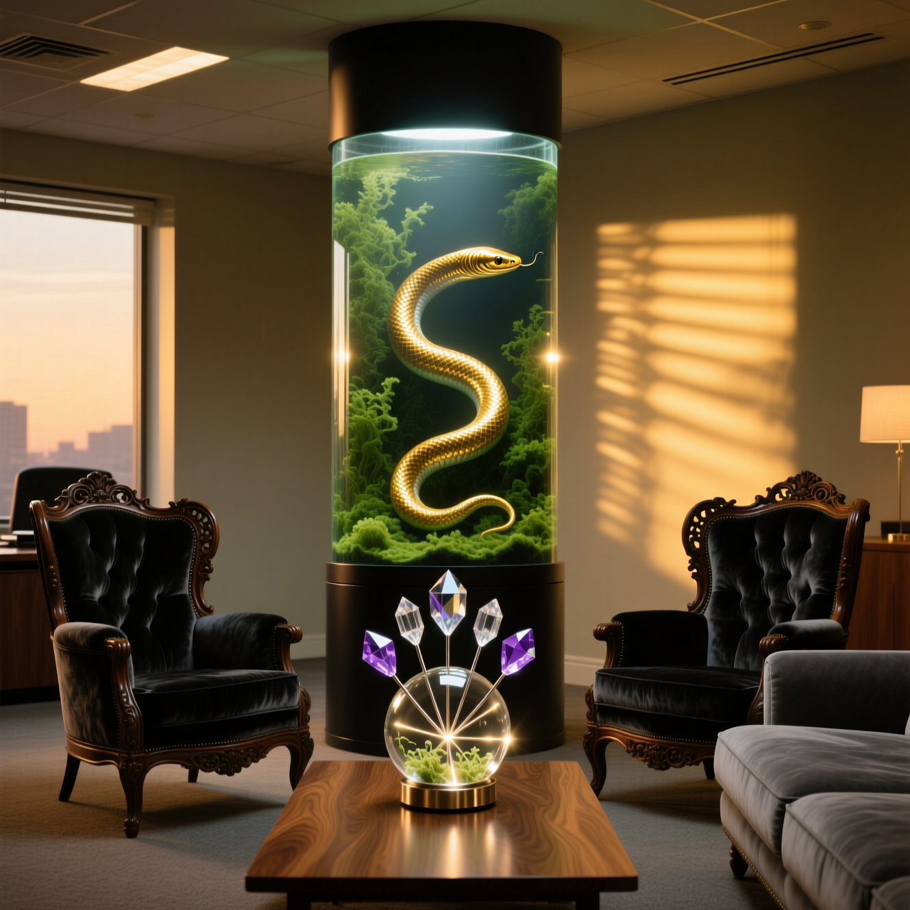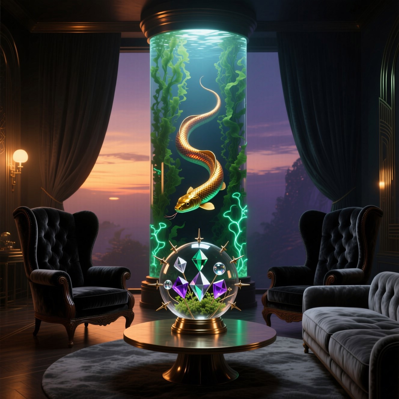 Кабинет Ариадны преобразился. Исчезли пуфики и подушки. Вместо них появились кресла — крутые, массивные, из тёмного, почти чёрного дерева, с высокими спинками и широкими подлокотниками, такими, чтобы можно было развалиться по-хозяйски. И невысокий диван, обтянутый прочным серым велюром, на котором даже дракон в килте чувствовал бы себя уютно. Но главным украшением комнаты теперь был аквариум — цельная стеклянная колонна от пола до потолка, в которой медленно танцевали водоросли всех оттенков изумрудного. Снизу, от скрытой подсветки, тянулись вверх вереницы серебристых пузырьков. А среди этой подводной чащи плавала золотая рыба-змея. Длинная, гибкая, с переливчатой чешуёй, она не плыла, а словно парила, то бесшумно всплывая к поверхности, то спускаясь ко дну, извиваясь вокруг стеблей водорослей. Это было гипнотическое зрелище — меланхоличный, вечный танец в столбе тихой воды.