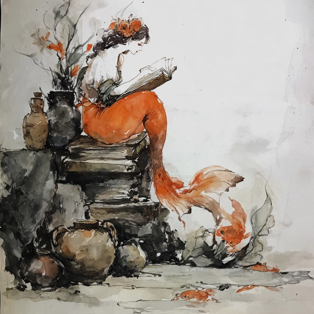 A mermaid is looking for an interesting book about mermaids. --chaos 5 --sref 431501539 --profile cy16otn --stylize 150