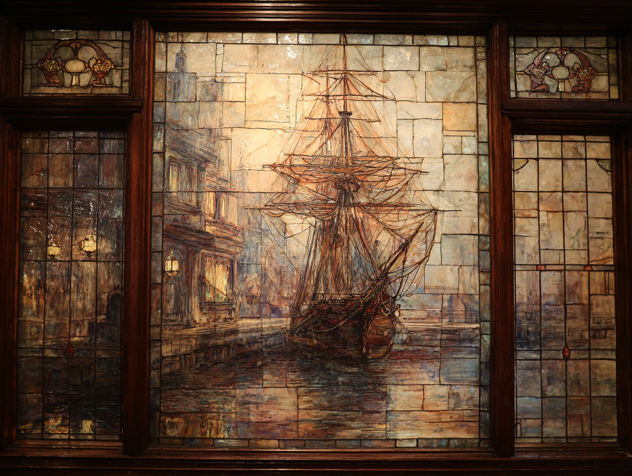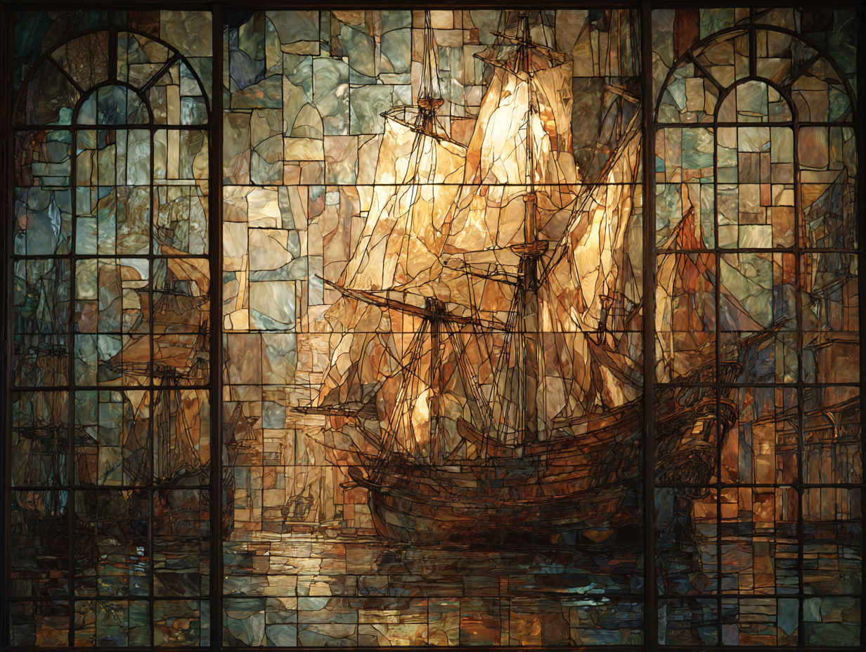 The stained glass window depicts a sailing frigate at anchor in a seaport. Technique: Alcohol paints on glass --chaos 5 --ar 4:3 --stylize 150