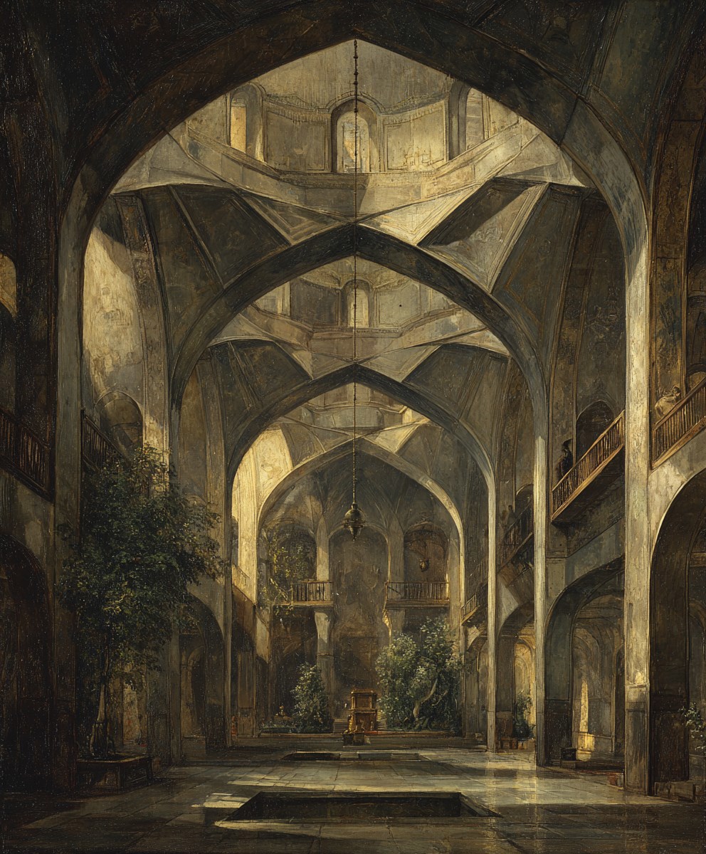 Zoroastrian temple. a large interior space, high entrance arches, flying enfilades of ceilings under the very ceiling, China, 18th century --chaos 5 --ar 5:6 --profile cy16otn --stylize 150