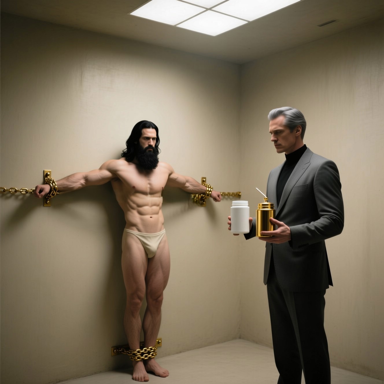 От массивных браслетов на его лодыжках и запястьях тянулись толстые, кажущиеся невесомыми цепи из тусклого жёлтого металла. Они не были натянуты и терялись в специальных гнёздах в стене. Цепи были золотыми. Настоящее, чистое золото, но обработанное так, что оно не слепило, а лишь тускло мерцало.