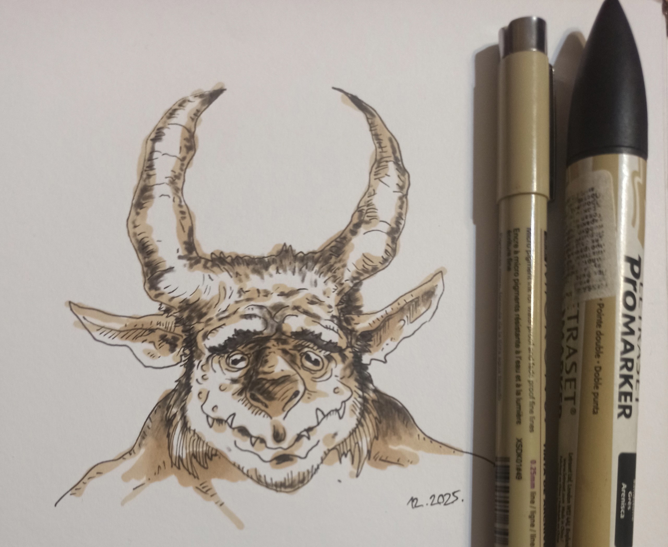 Рогоносец Автор: Игорь Авильченко Когда от нефиг делать чирикаешь по бумажке во время прослушивания какого-нибудь блогера. демон, милота, рисунок линером, рогатый, скетч, монстр, рисунок маркерами 9 Пожаловаться