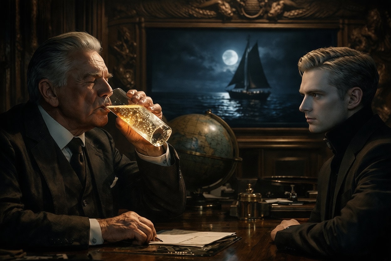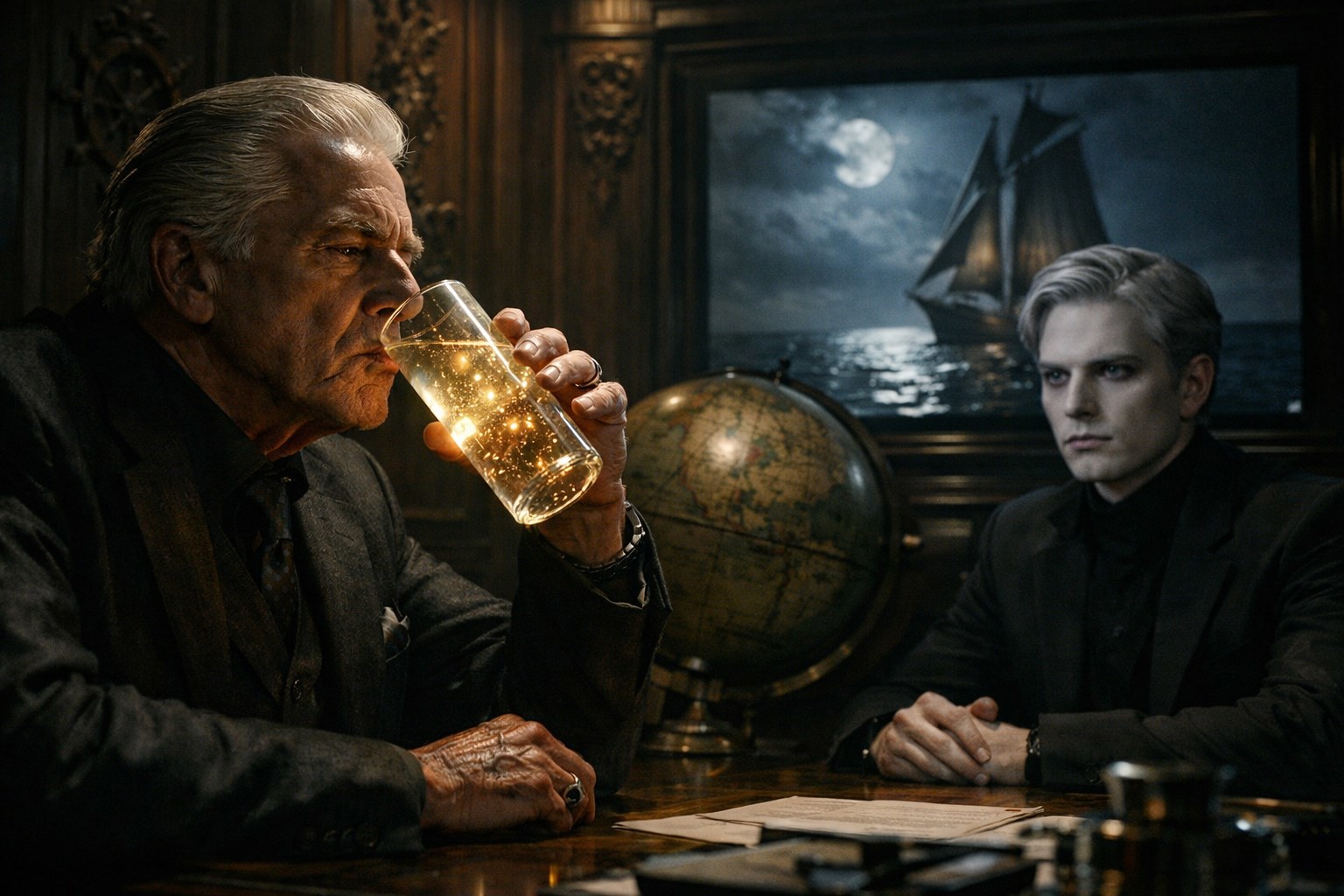 Яков Вилимович взял цилиндр, медленно, с неожиданной для его мощных рук аккуратностью отвинтил герметичную крышку. Извлёк внутренний прозрачный сосуд. Снял с него защитный колпачок. В кабинете поплыл слабый, странный аромат, с оттенком озонированного воздуха после грозы. Потом поднёс сосуд к губам, отпил небольшой глоток. Не глотал сразу — подержал на языке, будто дегустатор, пытающийся разобрать сложный букет старого виски. Глаза его на мгновение потеряли фокус, уставившись куда-то в резной дуб над камином.