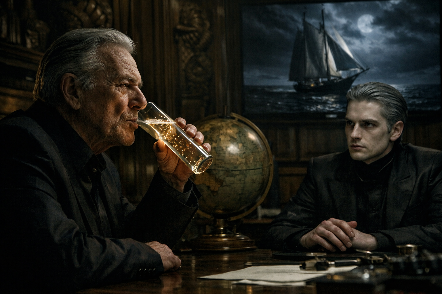 Тот принял сосуд без колебаний, как принял бы переданный документ. Поднёс к губам, сделал один точный глоток. Его собственное, всегда бесстрастное лицо тоже на миг замерло в концентрации. Казалось, он не просто пьёт, а сканирует содержимое на предмет скрытых данных. Потом отставил окончательно пустой сосуд, поставил его на чёрную столешницу, где тот замер, слабо поблёскивая в свете настольной лампы.