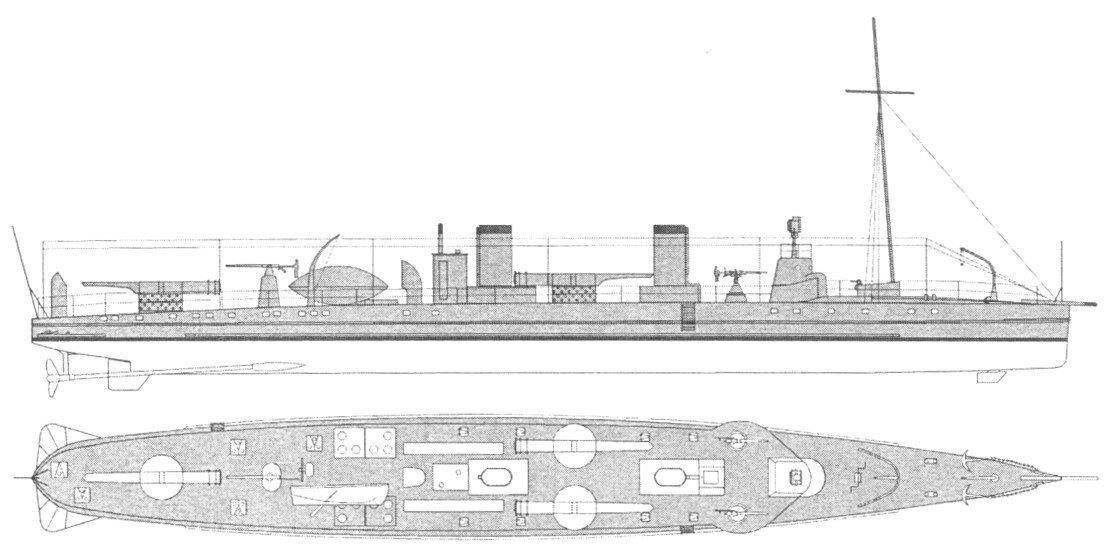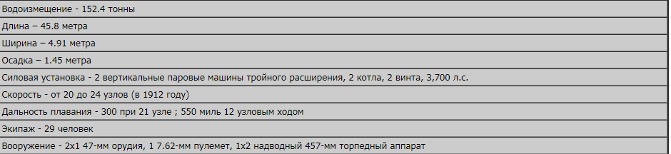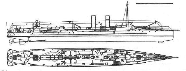 Вооружение- 1 × 57 мм/40 Гочкисса (2,2 дюйма) пушка QF 6 pounder Hotchkiss и 2 × 47 мм (1,9 дюйма) орудия Hotchkiss 3-pdr QF или 3 × 47 мм (1,9 дюйма) орудия. 3 × 457 мм (18 дюймов) торпедных аппарата(3x1)