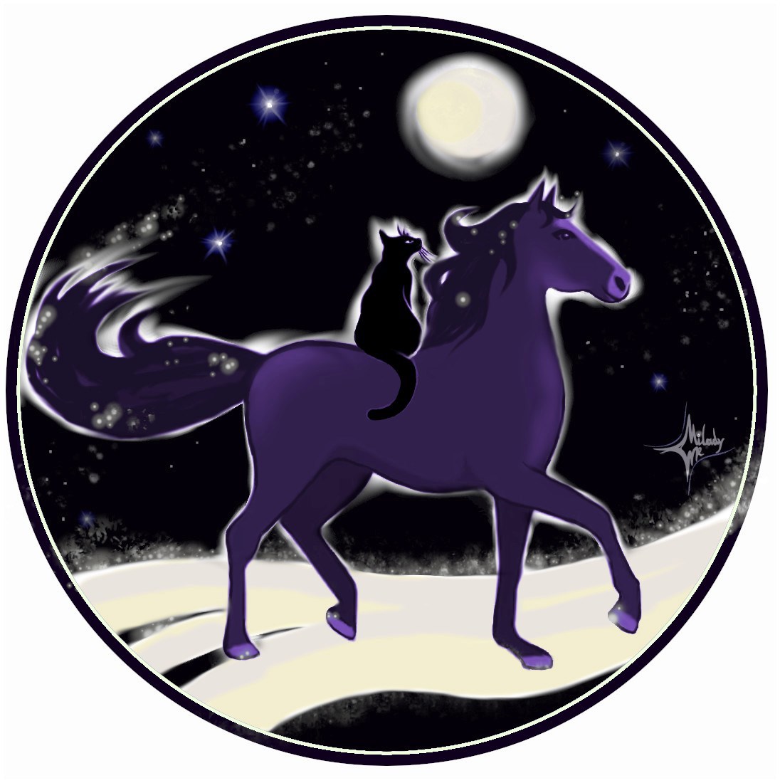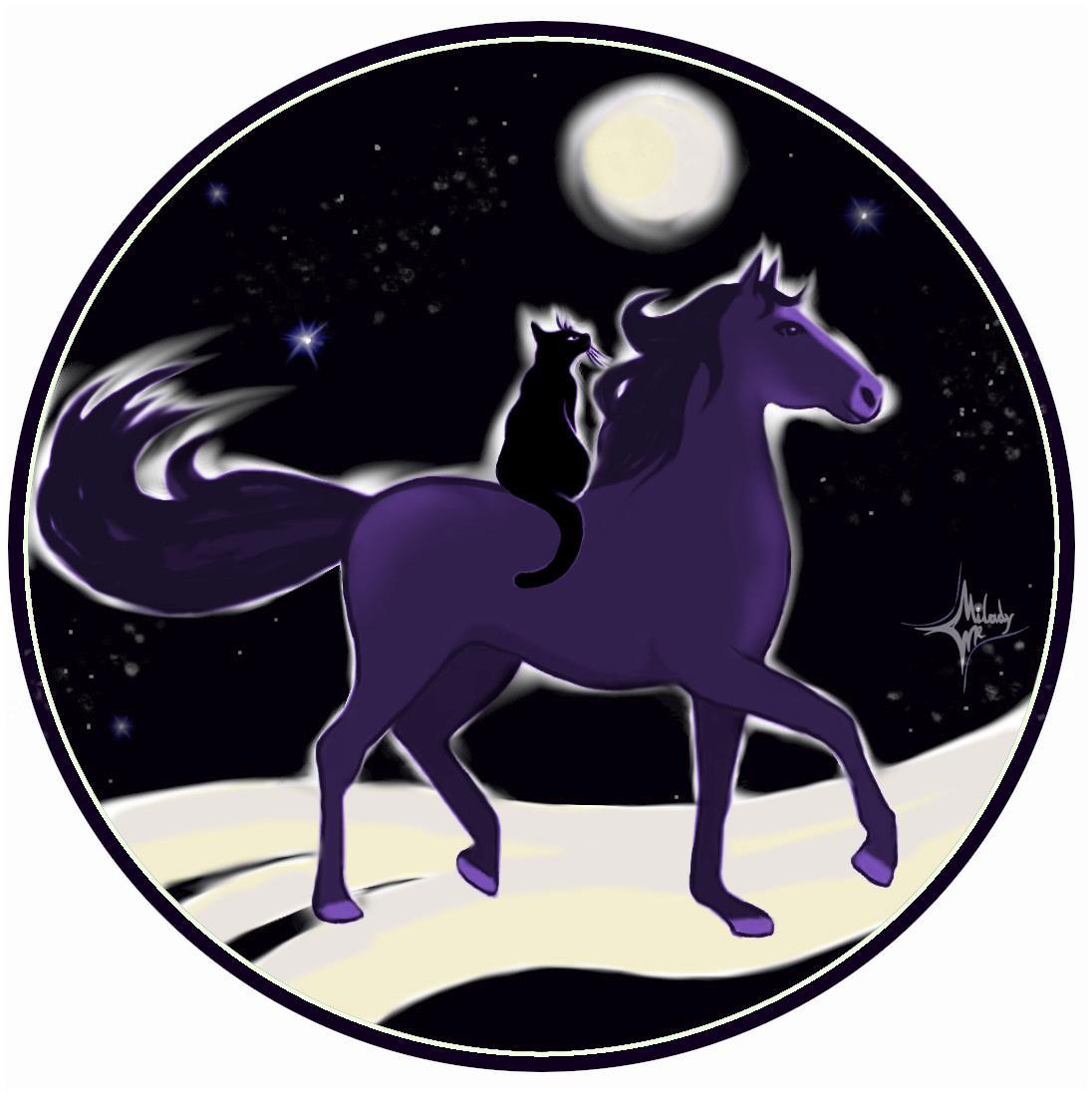 Ну вот, я попробовала поиграть с минимумом цветов, чтобы не размахиваться на полотна, и специально для Псевдокисы добавила на рисунок кота, чтобы лошадке и дизайнеру было не скучно. Как водится, кот отобрал ведущую роль, пригласил луну и звёзды и вот, на коне. Встречайте.