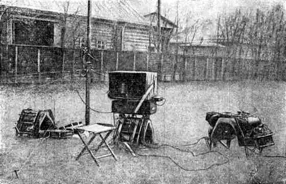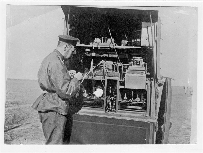 Приём телеграммы на "полевой радиостанции обр. 1905 г." В Военной электротехнической школе капитан И. А. Леонтьев и штабс-капитан Д. М. Сокольцев разработали отечественную “полевую радиостанцию образца 1905 г.”, которая обеспечивала устойчивую связь на расстояние до 77 км, а с антенной, поднятой на воздушном змее, – до 140 км.