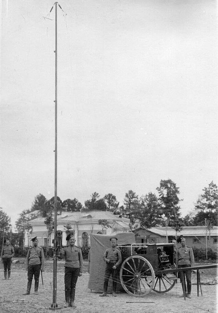 В 1910 году была создана полевая искровая радиостанция, разместившаяся на четырех двуколках и обеспечивавшая связь на расстоянии 160,5 км. Диапазон волн передатчика составлял 400–2300 м, приемника — 320–2500 м. Антенна — зонтичного типа. Высота телескопической мачты — 25 м. Время развертывания станции — 30 минут. Аналогичная аппаратура компании Маркони умещалась на 14 двуколках.