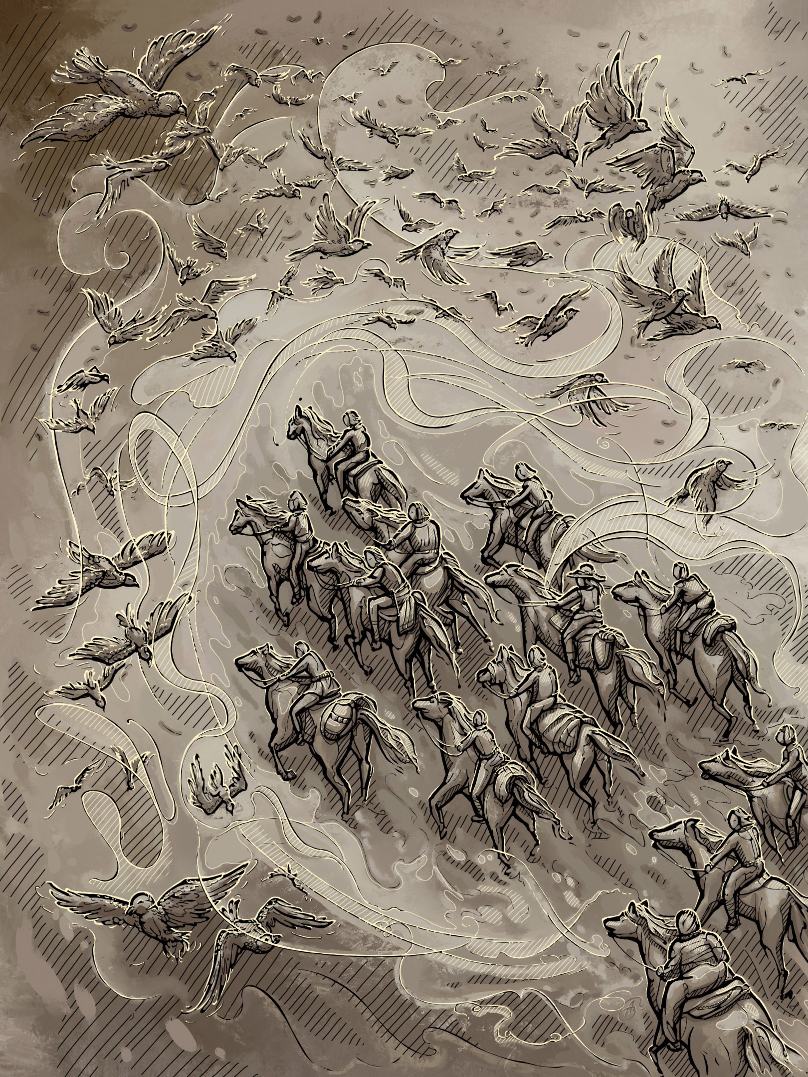 Она плавно сменялась одной с протяжной ноты на другую, игриво скользила между всадниками, теребила гриву лошадей, ускользала из-под копыт и окружала нетерпеливых хищных птиц, мягко отводя их в сторону от нашего отряда.