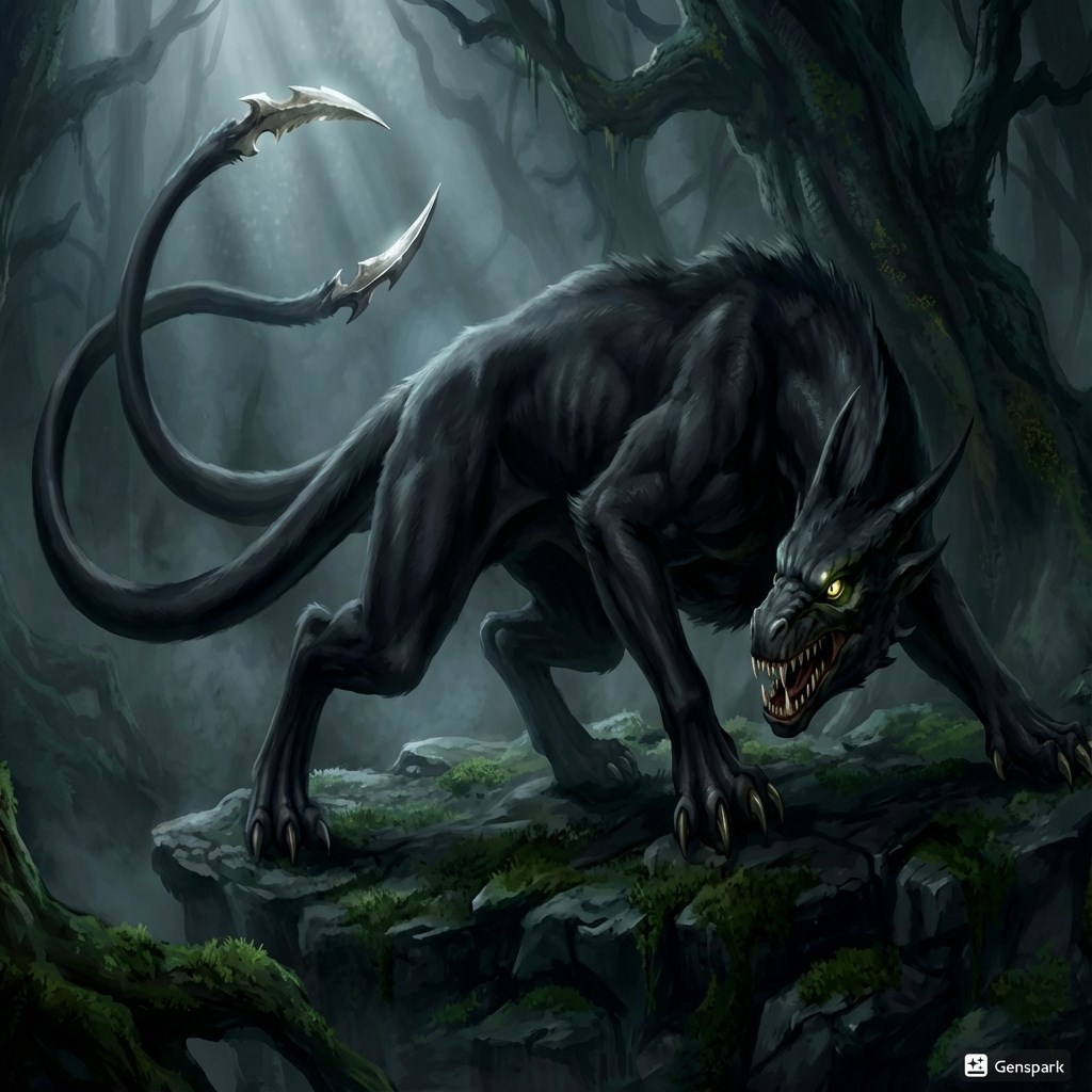 [Описание: Теневая химера класса «засадник». Тело гибкое, мускулистое, покрытое короткой, поглощающей свет шерстью. Обладает двумя хвостами, каждый из которых оканчивается костяным лезвием, отточенным до молекулярной остроты.]