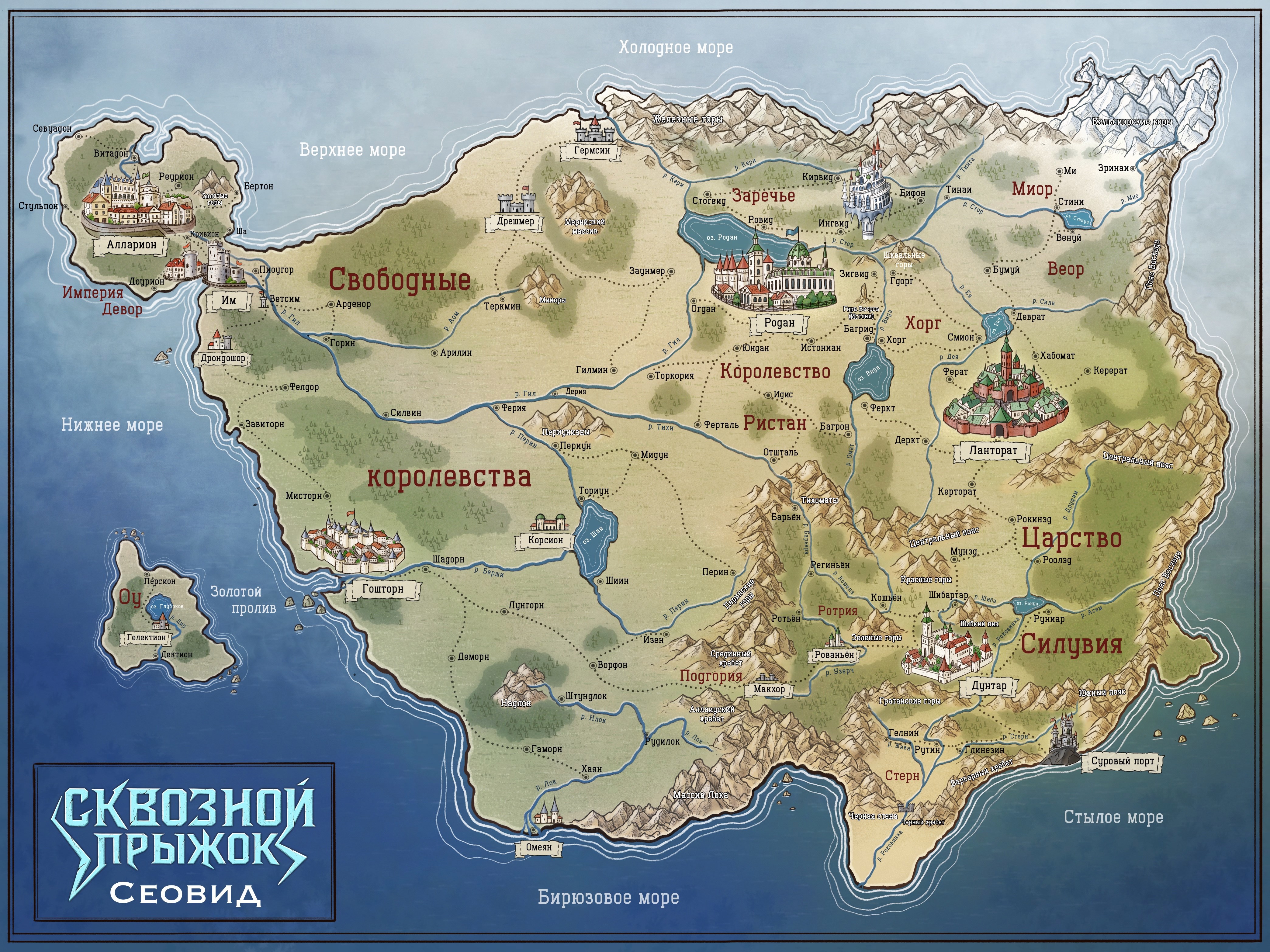 Детализированная карта материка Сеовид из романа "Сквозной прыжок". До сих приводит в состояние некоторой экзальтации. Для меня, как автора этого мира, сложнее всего было выбрать, что не изображать на этой иллюстрации. В истории так много событий и значимых мест, но уместить их все на столь обширной территории оказалось не так просто.